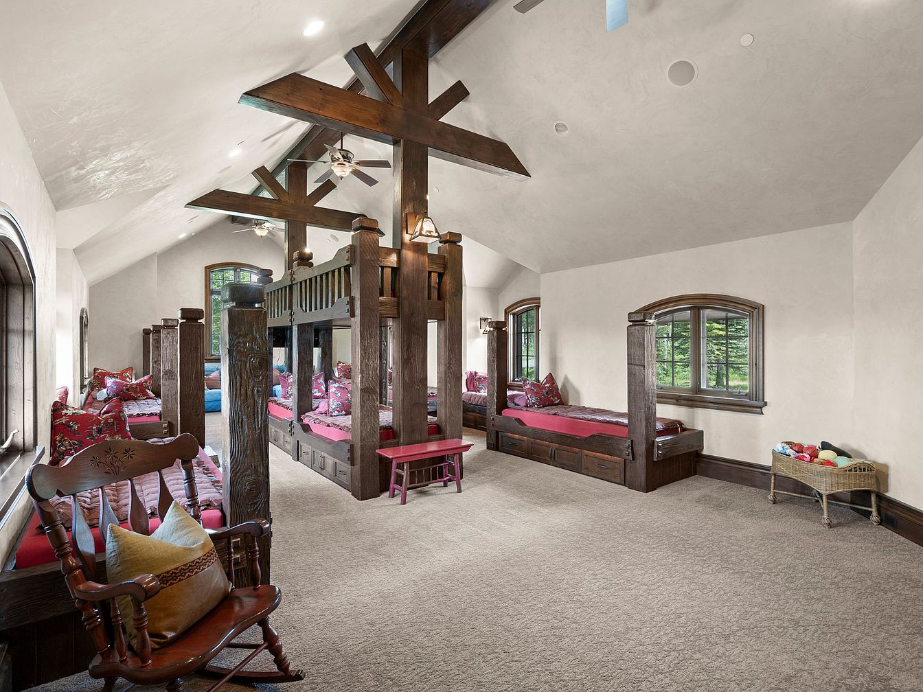 This spacious kids’ bunk room features high ceilings accentuated by striking wooden beams, creating an open and airy atmosphere. Two sets of charming bunk beds provide ample sleeping space, dressed in vibrant floral bedding that adds a playful touch. Cozy nooks with plush cushions invite relaxation and reading, while large windows frame scenic views, ensuring natural light floods the room. The warm color palette of soft neutrals merges beautifully with the rich wooden elements, including a classic rocking chair that complements the inviting feel. Thoughtfully designed for family gatherings, this room promises comfort and joy for children.