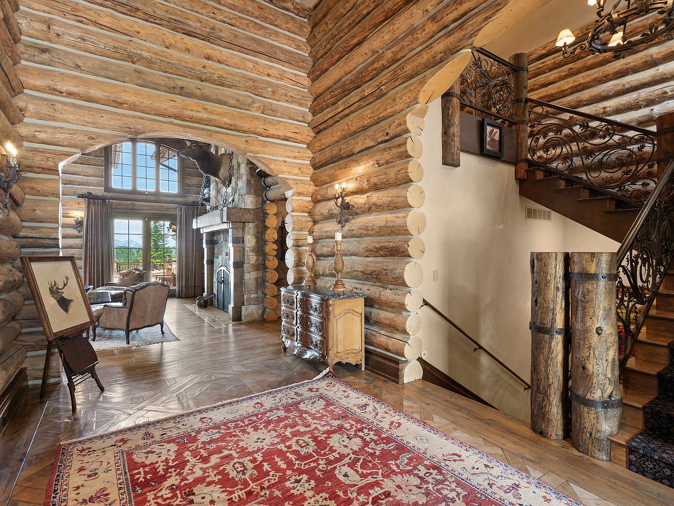 The grand entrance hall showcases stunning log architecture that exudes rustic charm and warmth. Rich wooden beams flourish throughout, complemented by intricate wrought-iron details on the elegantly spiraled staircase. A spacious layout invites family gatherings, with natural light streaming through large windows that frame the picturesque outdoor views. The inviting seating area features plush, vintage armchairs positioned around a stone fireplace, perfect for cozy evenings. A beautifully patterned area rug adds visual interest to the hardwood floor, while tasteful artwork and antique furniture pieces enhance the timeless aesthetic. This welcoming space effortlessly balances elegance and comfort.