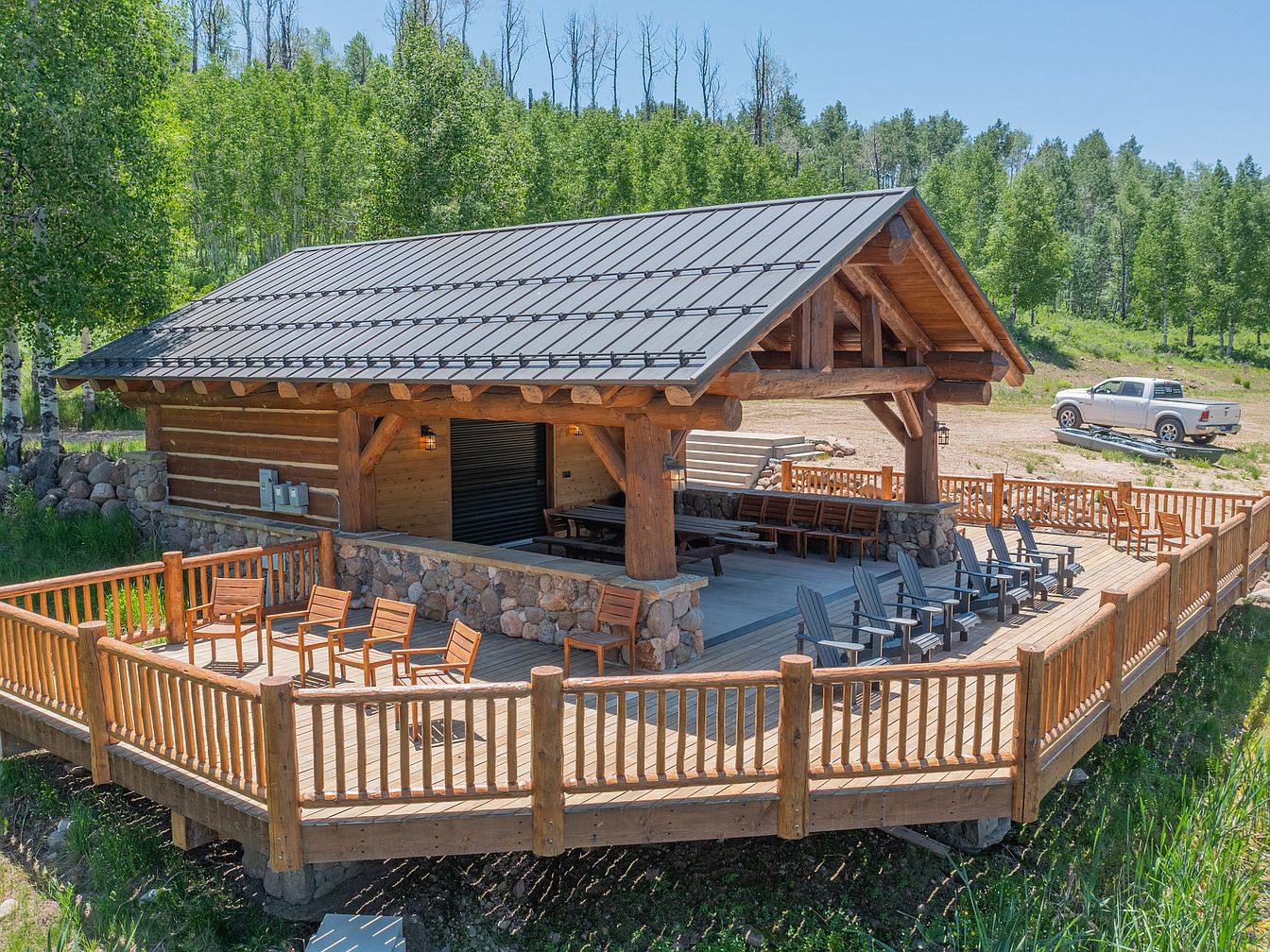 This outdoor patio retreat features a stunning wooden deck surrounded by natural beauty. The rustic design combines logs and stone, creating a warm, inviting atmosphere. Comfortable wooden seating invites relaxation, while an expansive layout allows for ample social gatherings. The exposed beams and metal roof highlight a modern yet traditional aesthetic. Perfect for family gatherings, the space offers both shade and sun, enhancing outdoor enjoyment. The well-placed seating arrangements encourage conversation and togetherness, making it an ideal spot for family meals or cozy evenings under the stars. Lush greenery surrounds the area, adding to the serene ambiance.