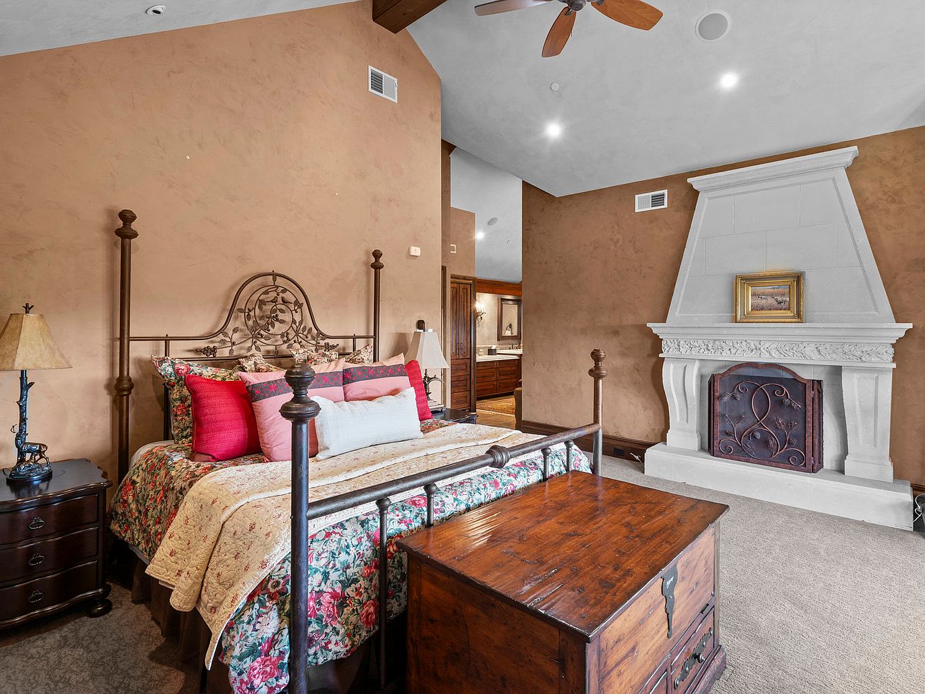 This elegantly designed master bedroom exudes warmth and comfort with its rich, earthy tones and cozy textiles. The focal point is a stunning iron bed adorned with a vibrant floral quilt, complemented by plush pillows in shades of red and white. A wooden hope chest at the foot of the bed adds functional charm. Natural light floods the room through the high ceilings, featuring exposed wooden beams, enhancing the inviting ambiance. A stately fireplace with intricate detailing provides a perfect spot for relaxation. The soft carpet underfoot offers a family-friendly touch, ensuring a serene space for restful nights.