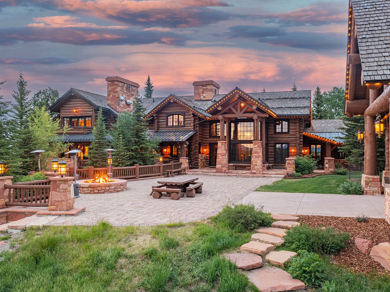 Surrounded by lush greenery and majestic trees, this American home exudes a warm, inviting atmosphere. The main structure showcases a stunning blend of log cabin aesthetics and modern design, with stone accents, expansive windows, and a charming gabled roof. Pathways woven between manicured gardens lead to cozy outdoor living spaces, highlighted by soft landscape lighting. A rustic pavilion, perfect for gatherings, complements the property with its open layout. The warm earth tones of the house harmonize with the natural surroundings, providing a family-friendly haven great for relaxation and entertaining amidst nature’s beauty.