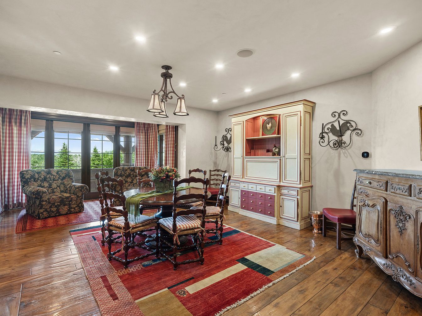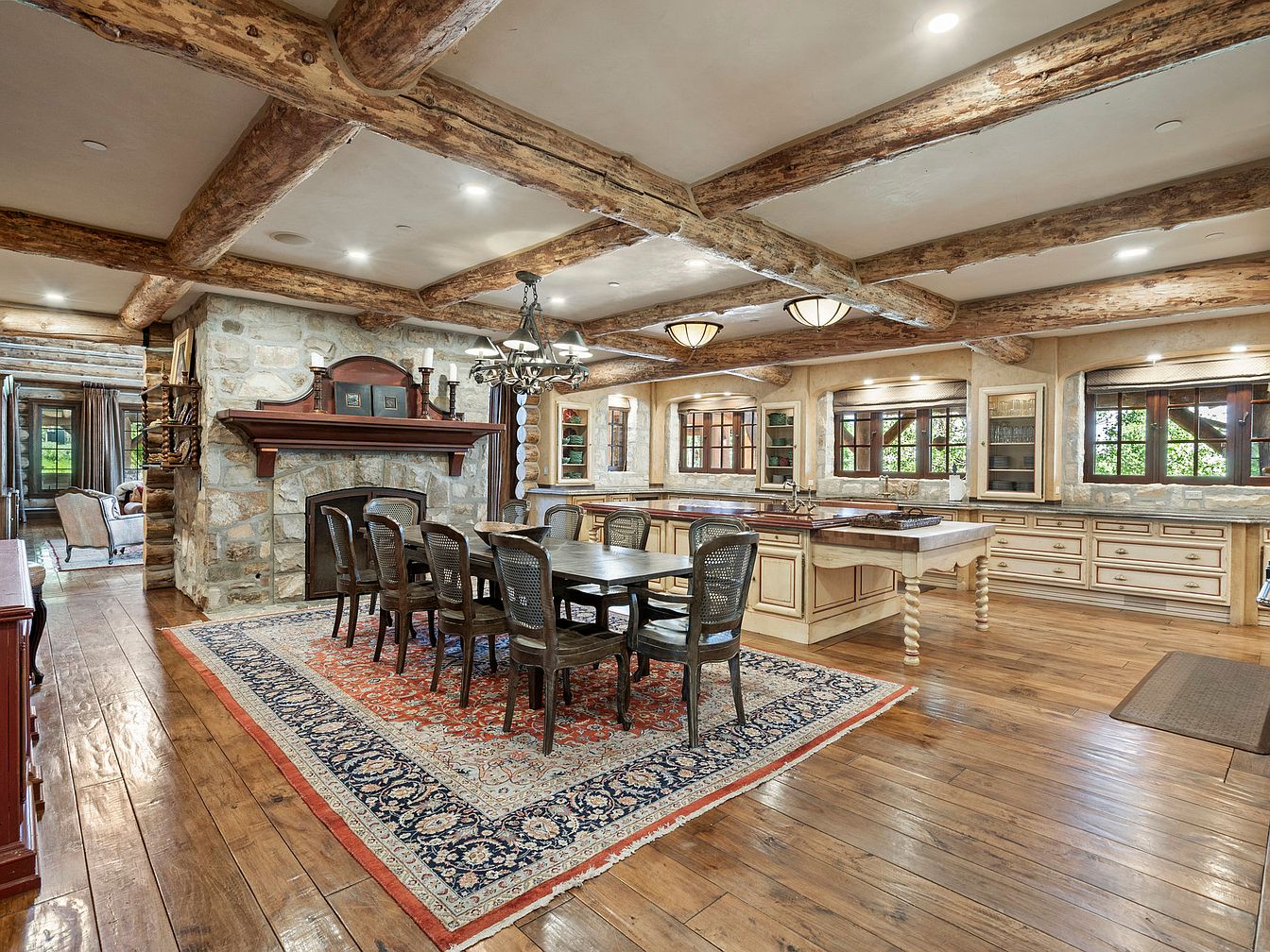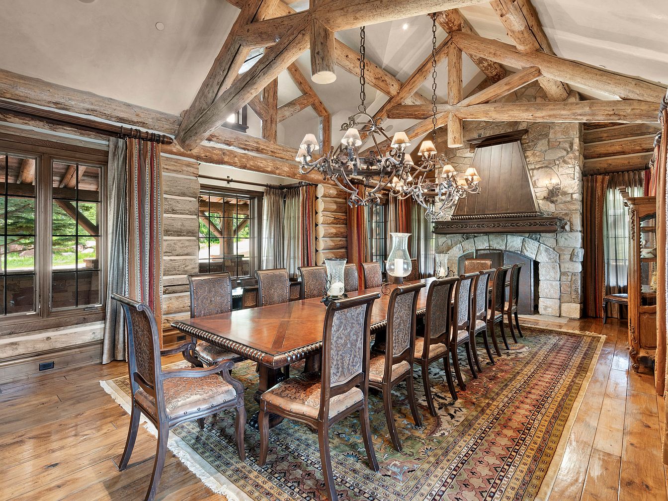 Showcasing a spacious dining area, this home features a stunning, rustic design with exposed wooden beams that add charm and character. The long, polished table set with elegant upholstered chairs invites family gatherings. A grand chandelier illuminates the space, enhancing its welcoming ambiance. The natural stone fireplace serves as a captivating focal point, surrounded by intricately patterned rugs that blend traditional and contemporary aesthetics. Tall windows draped with rich, warm fabrics usher in natural light, creating an inviting atmosphere. Each detail, from the wood accents to the tasteful decor, emphasizes comfort and a sense of togetherness.