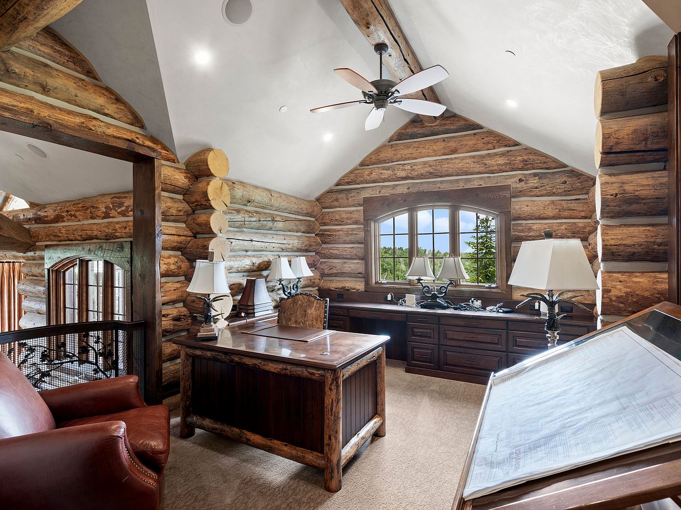 This inviting home office features rustic log cabin architecture, characterized by warm wooden beams and paneling that create a cozy atmosphere. A large window offers ample natural light and picturesque views, enhancing the serene working environment. The space is designed with functionality in mind, showcasing a sturdy wooden desk, a leather armchair, and elegant table lamps for improved task lighting. Neutral tones blend seamlessly with the rich textures of the wood, while plush carpeting adds comfort underfoot. The layout promotes productivity and relaxation, making it an ideal family-friendly workspace, perfect for creativity or focus.
