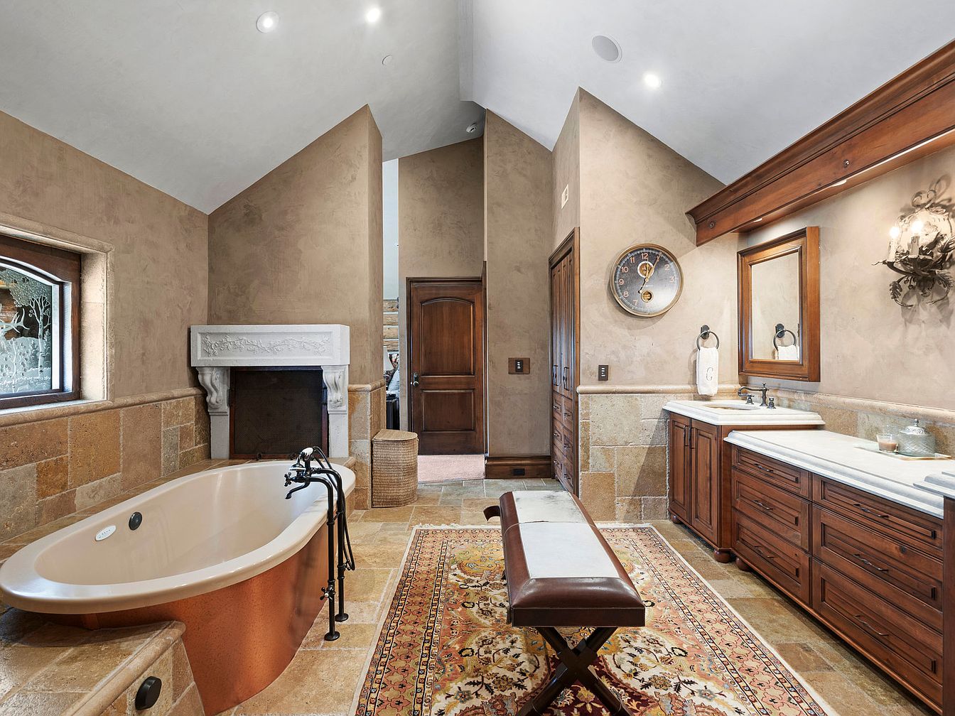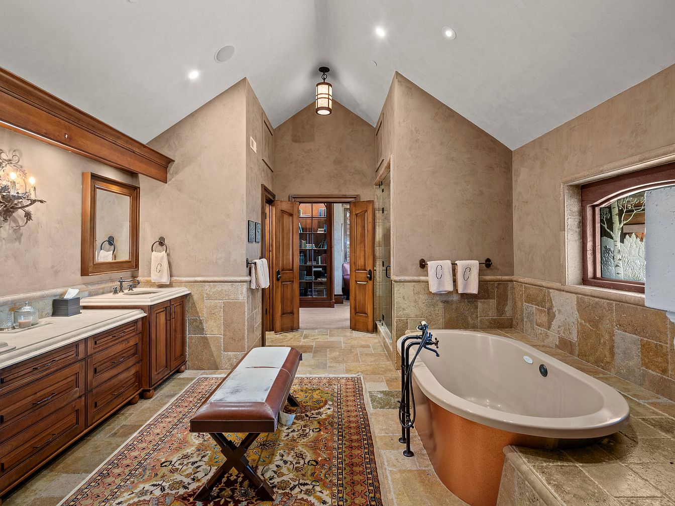This spacious bathroom exudes elegance with its high vaulted ceiling and natural light filtering through the custom windows. The centerpiece is a stunning freestanding copper bathtub, providing a serene escape amid the stone and warm-toned materials. Rich wooden cabinetry complements the delicate detailing in the architectural moldings. A marble countertop enhances the sophistication of the dual sinks, while a tasteful vintage clock adds a timeless touch. The earthy color palette, featuring soft browns and tans, creates a comforting atmosphere. Family-friendly features include ample storage and a cozy seating area, making this a perfect retreat for relaxation.
