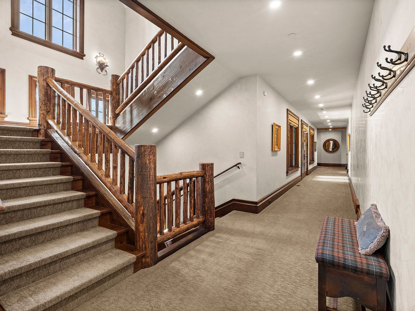 The entrance hallway beautifully balances elegance and warmth, showcasing a blend of modern design and rustic charm. Sturdy wooden beams frame the staircase, leading elegantly to the upper floor, while plush carpeting ensures comfort underfoot. Natural light floods the space through large windows, accentuating the creamy walls and rich brown wood accents. Family-friendly elements include a cozy bench adorned with plaid fabric, perfect for easing shoes on and off. The charming artwork and strategically placed hooks along the wall add a personal touch, ensuring functionality and style coexist perfectly in this welcoming entryway.