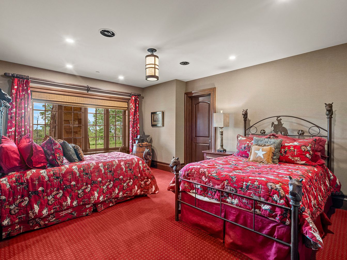 This cozy kid’s bedroom features two charming beds adorned with vibrant red bedding, each boasting playful western motifs. The room is accented with deep red carpet, enhancing its warm and inviting atmosphere. Large windows framed with floral-patterned drapes allow natural light to flood the space while providing picturesque views of the outdoors. A sturdy wooden bedside table with a stylish lamp adds a touch of practicality. Rich wood accents can be seen in the doors and furniture, complemented by earthy tones on the walls. This delightful space is designed for comfort and creativity, ideal for family bonding.