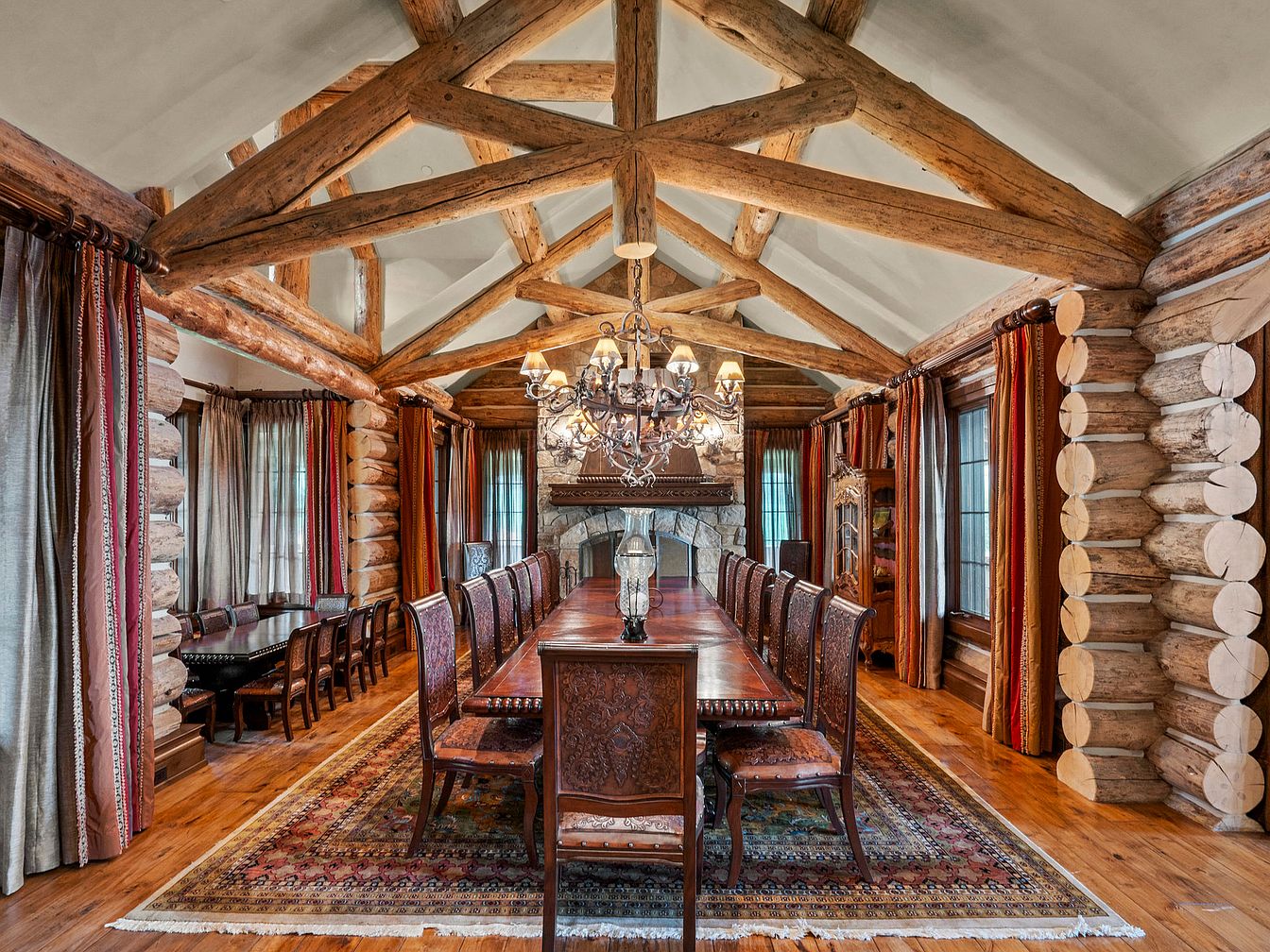 This inviting dining room features rustic charm and spacious design, perfect for family gatherings. High, exposed wooden beams illuminate the space, enhancing the log cabin aesthetic. A long, polished dining table is surrounded by intricately carved, upholstered chairs, offering comfort during meals. Elegant drapery frames the large windows, providing a warm glow and showcasing the surrounding nature. The rich color scheme includes deep reds and earthy tones, complemented by a vintage area rug that adds texture. A stunning chandelier hangs above, completing the room’s cozy yet sophisticated ambiance and fostering memorable conversations over dinner.