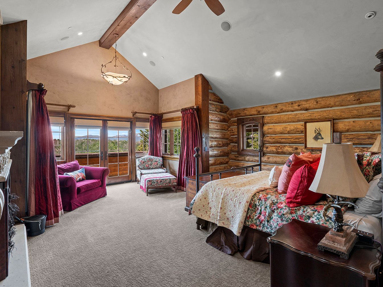 This inviting master bedroom features a stunning blend of rustic charm and modern comfort. The warm log walls add a natural woodsy feel, while the vaulted ceiling enhances the spaciousness. A plush king-sized bed adorned with floral patterned bedding and contrasting pillows invites relaxation. A tasteful sitting area, complete with a purple loveseat and a floral accent chair, provides a cozy nook to unwind. Large windows draped with rich, deep red curtains offer breathtaking views, making the room feel serene and connected to nature. Thoughtful lighting, including a unique chandelier, enhances the overall ambiance, creating a tranquil retreat.