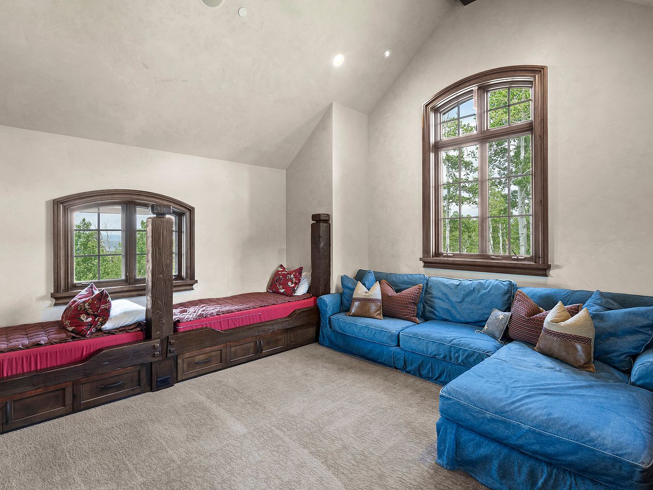 This inviting family lounge features a warm and spacious layout, perfect for relaxation and entertainment. Boasting vaulted ceilings, the room is adorned with large arched windows that bathe the space in natural light, offering picturesque views of the outdoors. A rustic wooden bed with a cozy, colorful bedding set complements the charm of the room, showcasing practicality and comfort for guests or children. The plush blue sectional sofa invites family gatherings, accented by an array of decorative pillows that add a touch of elegance to the casual atmosphere. Soft carpeting and muted wall colors enhance the cozy ambiance.