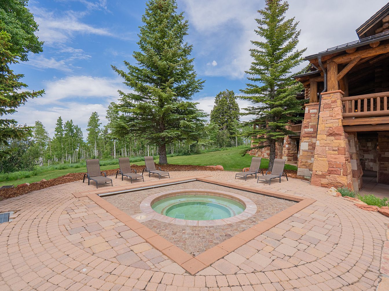 This tranquil outdoor patio features a round spa surrounded by meticulously arranged pavers, offering the perfect setting for relaxation. Flanked by four comfortable lounge chairs, the space is ideal for gathering with family and friends. Towering evergreen trees provide shade and enhance the natural beauty, effortlessly blending with the lush green lawn and surrounding landscape. The warm-toned stonework of the home complements the earthy aesthetic, creating a welcoming ambiance. The thoughtful design promotes a family-friendly atmosphere, encouraging outdoor enjoyment while highlighting seamless integration of nature with modern comfort. Enjoy serene moments in this picturesque retreat.