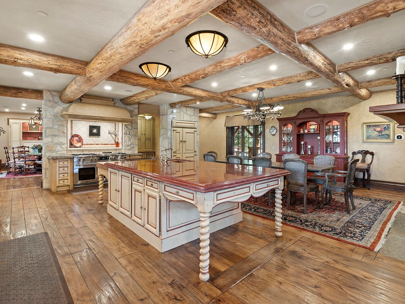This open concept kitchen seamlessly blends functionality with rustic charm. The centerpiece is a large island featuring a richly hued countertop with intricate trim and sturdy, turned legs, perfect for family gatherings. Exposed wooden beams soar across the ceiling, echoing the warmth of the hand-scraped wooden floors. A stone feature surrounds the professional-grade oven, balancing aesthetics with practicality. Elegant cabinetry is crafted in soft neutrals, beautifully complementing the dark wood of the dining set arranged under a stylish chandelier. Large windows invite natural light, enhancing the welcoming atmosphere, making it ideal for both cooking and socializing.