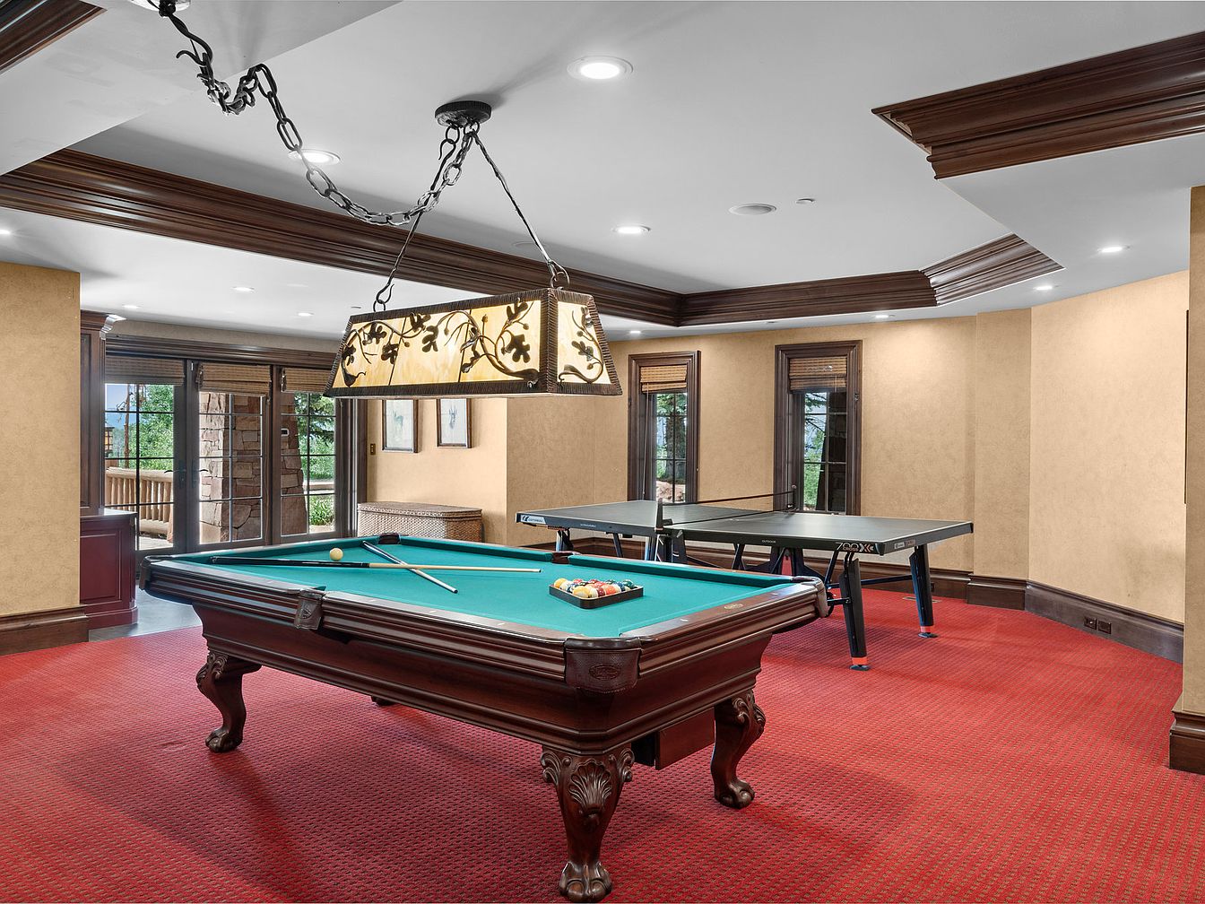 This inviting game room features a vibrant red carpet that adds warmth to the space, complemented by elegant wood trim around the ceiling and windows. The centerpiece is a rich, antique-style pool table, perfectly lit by an intricately designed overhead fixture with floral accents. Nearby, a sleek ping pong table caters to family fun, ensuring a variety of entertainment options. Large windows allow natural light to flood the room, offering scenic views and a connection to the outdoors. Soft, neutral walls enhance the room’s cozy atmosphere, creating an ideal setting for relaxation and playful gatherings.