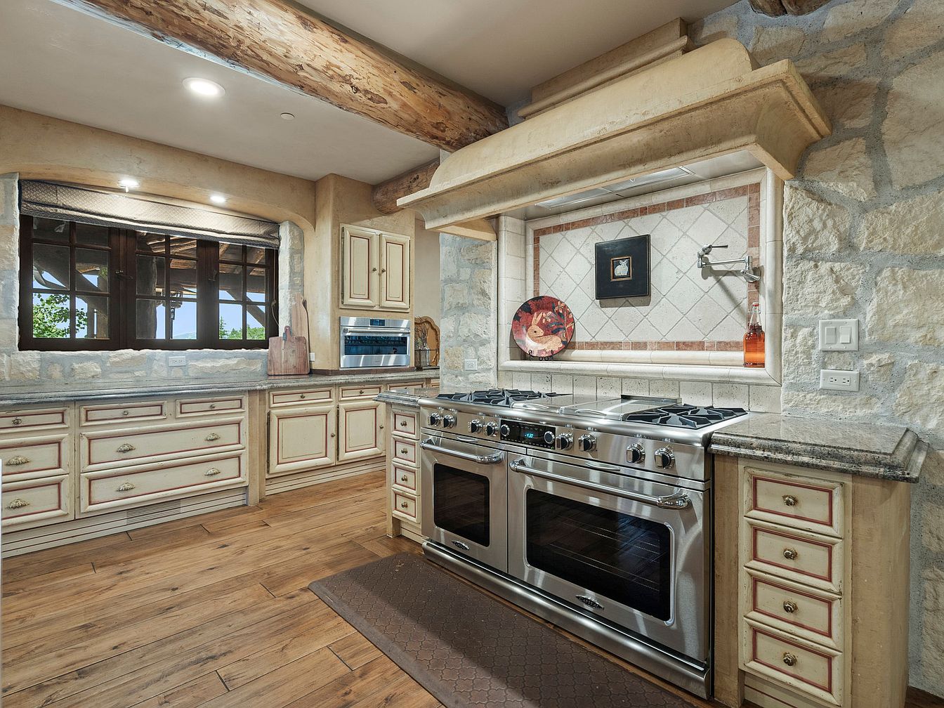This kitchen harmoniously blends rustic charm with modern convenience. Exposed wooden beams add a warm, inviting touch to the ceiling while the stone walls create a classic, earthy backdrop. Rich cabinetry showcases creamy tones accented with red detailing, providing a soft contrast against the sleek granite countertops. A spacious range with multiple burners stands ready for culinary adventures, complemented by thoughtful storage solutions. Natural light floods in through large windows, offering scenic views and fostering a cheerful atmosphere. Family-friendly features include ample counter space for meal prep and a cozy layout, making it an ideal hub for gatherings.