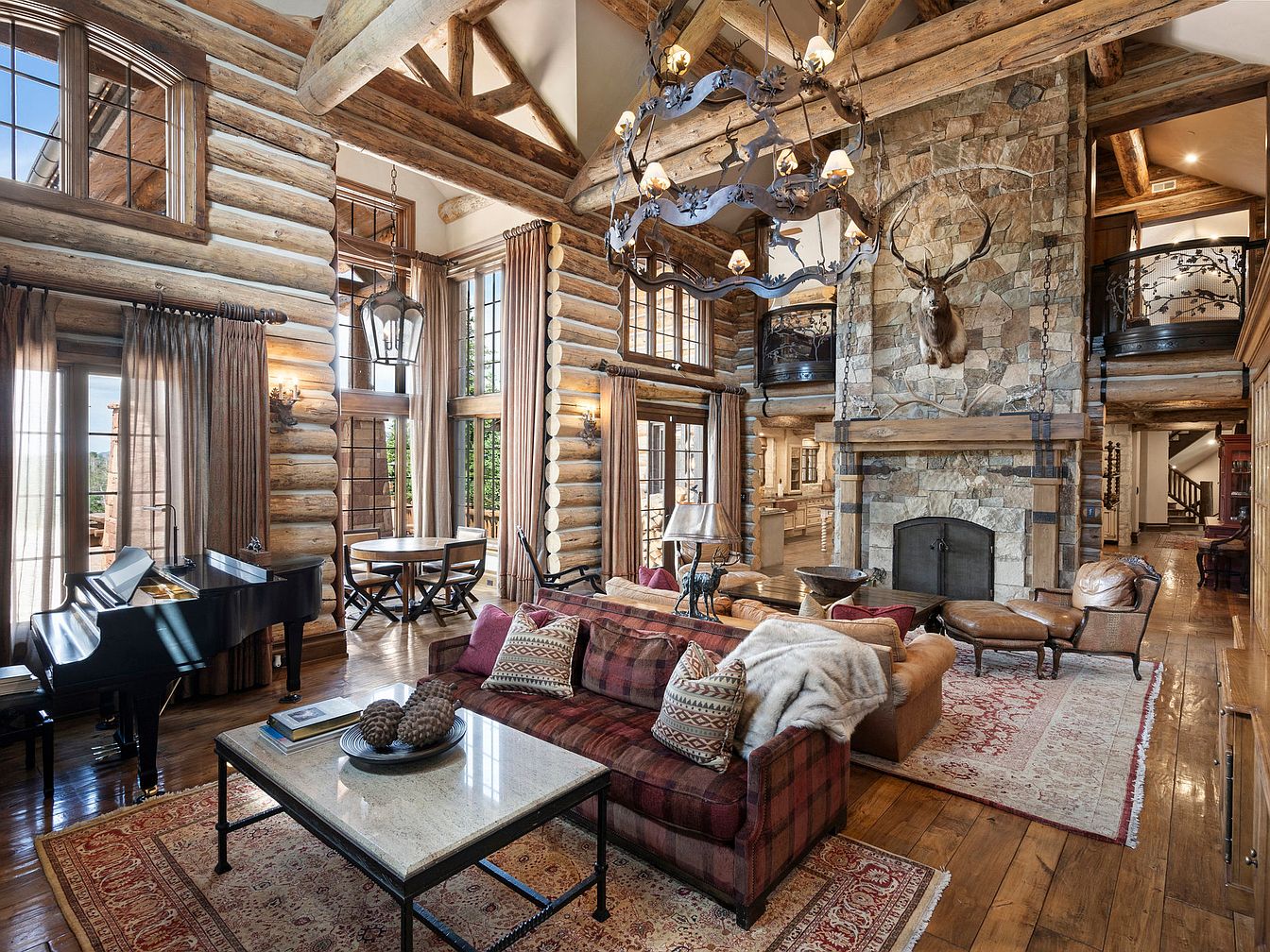 This stunning great room showcases a harmonious blend of rustic charm and modern comfort. The log walls and exposed wooden beams create a warm atmosphere, complemented by large windows that invite natural light and frame picturesque views. A grand stone fireplace stands as the focal point, adorned with antler decor, while rich textiles adorn the plush furniture, offering a cozy spot for family gatherings. The color palette features earthy tones that enhance the inviting ambiance. A grand piano in the corner adds a touch of sophistication, making this space perfect for entertaining and family life.