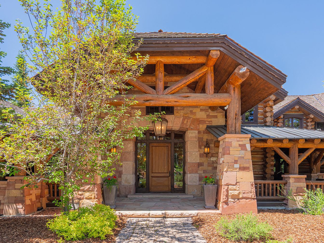 This inviting entryway showcases a stunning blend of rustic charm and modern elegance. Crafted with natural stone and warm wood beams, the façade exudes a cozy, welcoming vibe. The spacious porch, supported by robust log columns, invites family gatherings, while stylish lanterns provide soft illumination in the evening. Lush greenery and vibrant planters enhance the curb appeal, offering a refreshing touch of nature. The rich wooden door serves as a focal point, perfectly complementing the earthy color palette of browns and tans. This thoughtfully designed entrance reflects a harmonious balance of aesthetics and functionality, ideal for family-friendly living.
