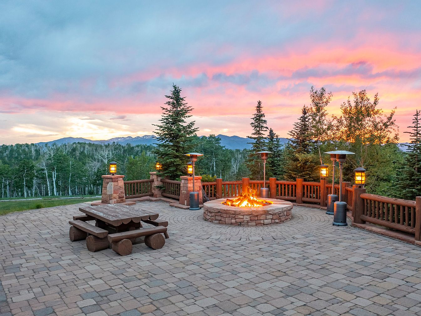 This stunning outdoor patio combines rustic charm with modern comfort, creating an inviting entertainment space perfect for family gatherings. Centered around a beautifully crafted stone fire pit, the layout encourages conversation and warmth, while the surrounding wooden railing adds a touch of natural elegance. Warm-toned outdoor furniture, including a sturdy picnic table, complements the earthy paver stones underfoot. Lantern-style heaters provide ambiance and warmth for cooler evenings, enhancing the cozy atmosphere. Majestic trees frame the scenic backdrop, and vibrant sunset hues paint the sky, completing this idyllic outdoor oasis tailored for relaxation and connection with nature.