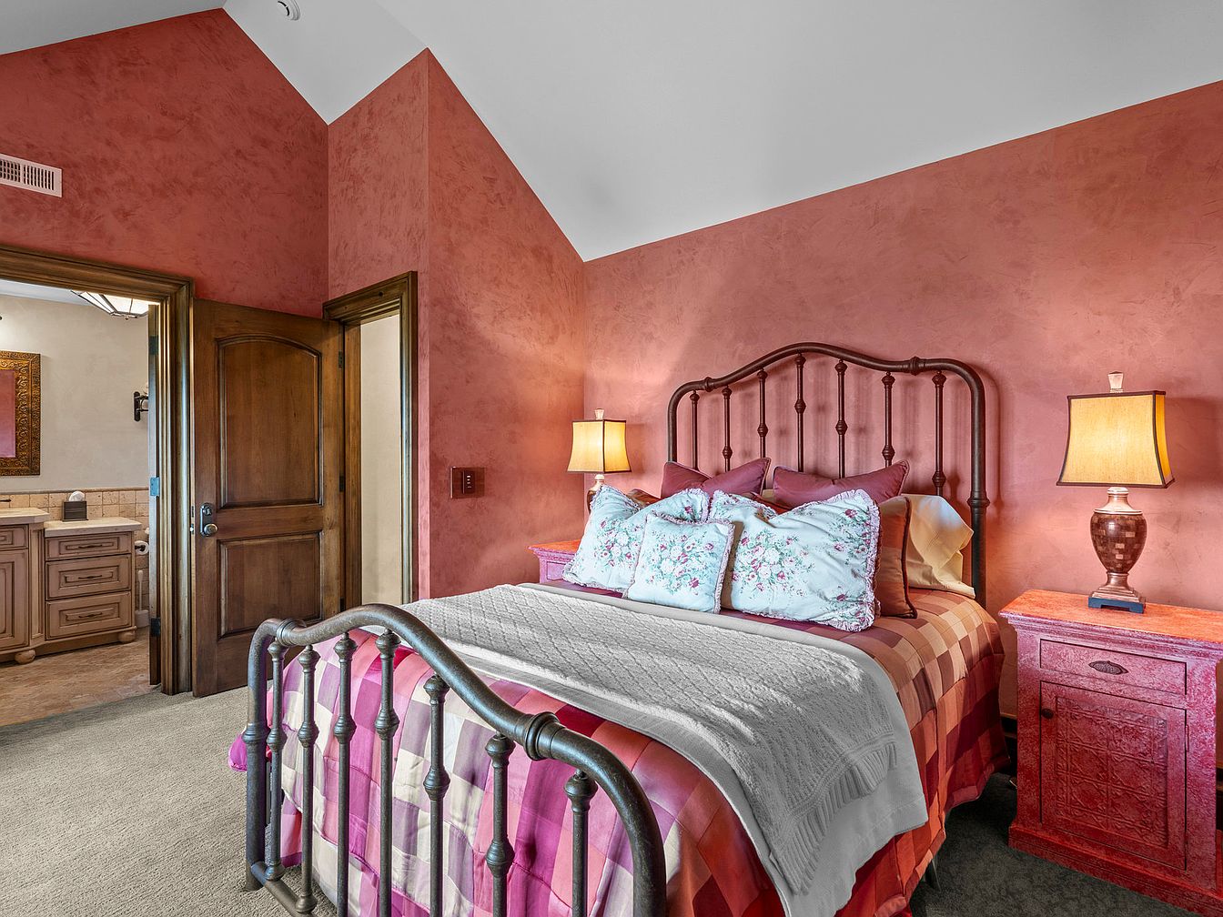 This master bedroom boasts a warm and inviting color palette, featuring soft peach walls that harmonize beautifully with the rich mahogany door and a wood-paneled ceiling. Dominating the space is a classic wrought-iron bed framed by elegant side tables, each topped with cozy lamps that add a touch of warmth. The bed, adorned with an array of patterned pillows and a plush throw, is perfect for restful nights. Plush carpeting enhances comfort, while the adjoining doorway leads to a well-appointed bathroom, adding functionality. The overall design creates a welcoming and stylish retreat for relaxation.