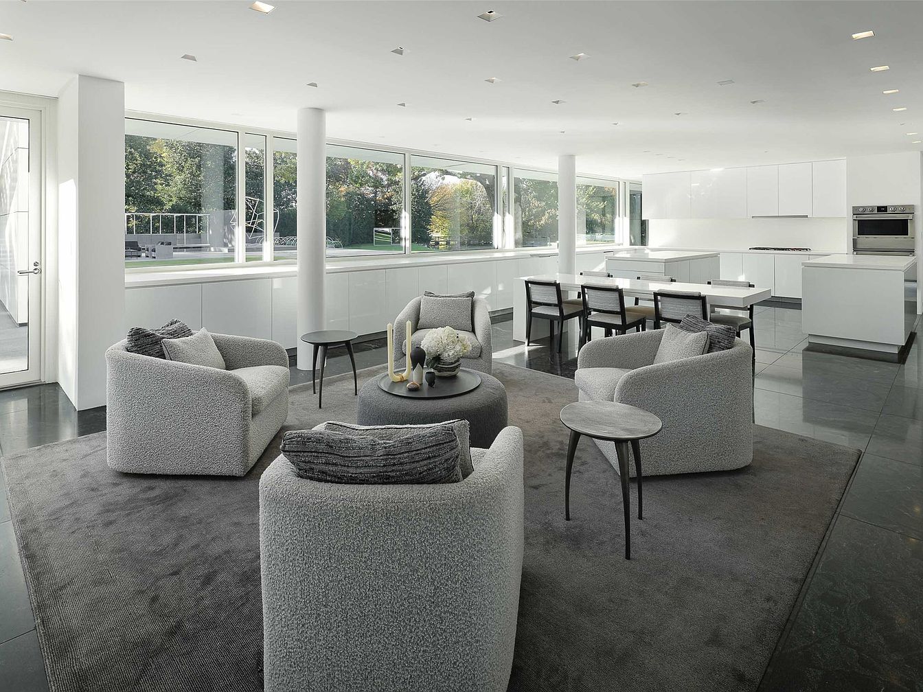 This space showcases a seamless blend of a living and dining area with an elegant modern kitchen in an open concept layout. Plush, textured armchairs are arranged in a cozy circular formation atop a soft grey rug, fostering conversation and togetherness, ideal for family gatherings. The expansive windows invite abundant natural light, creating a bright and inviting atmosphere while providing beautiful views of the surrounding greenery. Clean white cabinetry, minimalist décor, and sleek surfaces further emphasize a modern aesthetic. Neutral tones and soft fabrics establish a sense of warmth, while uncluttered lines keep the room kid- and family-friendly.