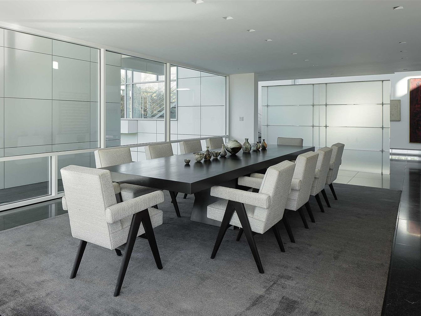 A spacious and inviting dining area centers around a long, sleek black table surrounded by ten plush, upholstered armchairs with striking dark wooden legs. The minimalist design is accentuated by clean lines and a soothing color palette of soft grays and whites, giving the space a calm, sophisticated feel. Large windows and glass partitions allow natural light to flood in, creating an airy, open atmosphere perfect for family gatherings or entertaining guests. The expansive gray area rug anchors the room, providing warmth and comfort underfoot, while modern decor elements add visual interest without overwhelming the serene aesthetic.