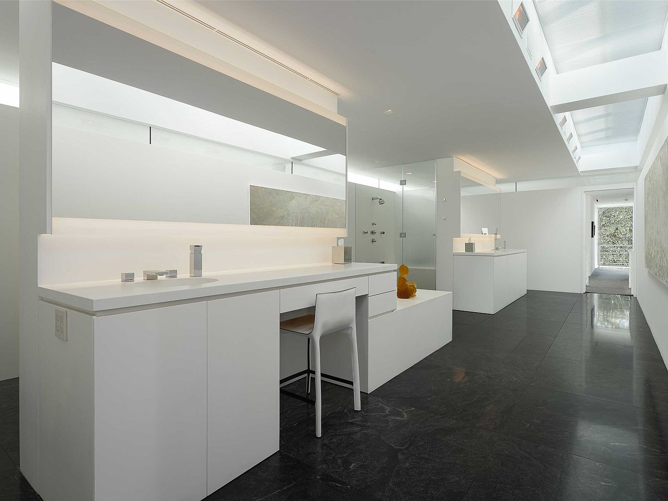 Expansive, open-concept bathroom featuring a sleek dual vanity with minimalist cabinetry and integrated sinks, perfect for a family-friendly morning routine. The space is illuminated by natural light streaming through skylights above, highlighting crisp white surfaces and contrasting dark stone floor tiles for a clean, contemporary aesthetic. Glass-enclosed walk-in showers add luxury and openness, while strategically placed seating provides comfort and convenience. Subtle built-in lighting under the vanity and ceiling offers soft illumination. The uncluttered design maximizes functionality and creates a serene, spa-like retreat ideal for families seeking both practicality and modern elegance in their home sanctuary.