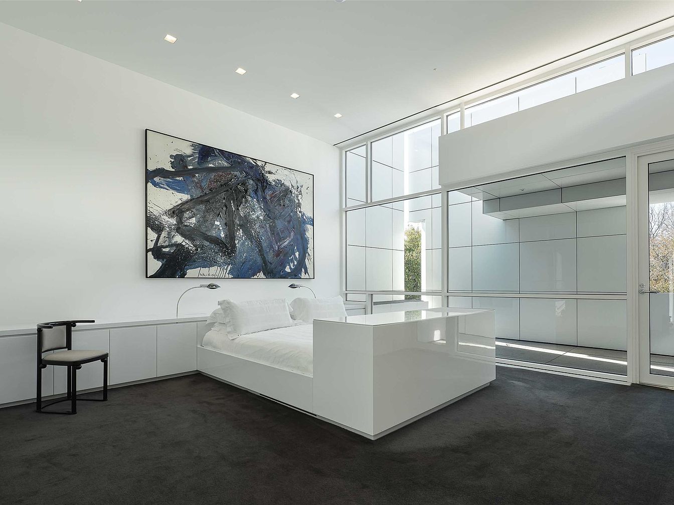 This bedroom suite exemplifies sleek modern luxury with its minimalist aesthetic and crisp geometric lines. Floor-to-ceiling windows allow ample natural light and connect the interior to serene outdoor views, creating an airy and open atmosphere that’s perfect for a family retreat or peaceful sanctuary. A solid white platform bed, dressed in layered white linens, anchors the space beneath a bold abstract artwork, adding a touch of sophistication. Low built-in cabinetry offers clever storage solutions, keeping the room uncluttered and family-friendly. Contrasting dark carpeting balances the bright palette, ensuring comfort underfoot and visual depth throughout the space.
