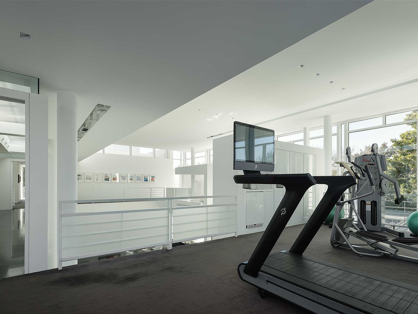 An open loft space serves as a modern home gym, featuring a state-of-the-art treadmill positioned near large floor-to-ceiling windows that fill the area with natural light. Minimalist white walls and frosted glass railings complement the clean lines and spacious feel. The sleek exercise equipment blends seamlessly with the architectural design, allowing families to work out together in a safe, visually appealing environment. Framed artwork adds subtle color and personality along one wall. Soft carpeting underfoot ensures comfort, while the glass accents and open layout create an airy, motivating atmosphere ideal for both adults and children.