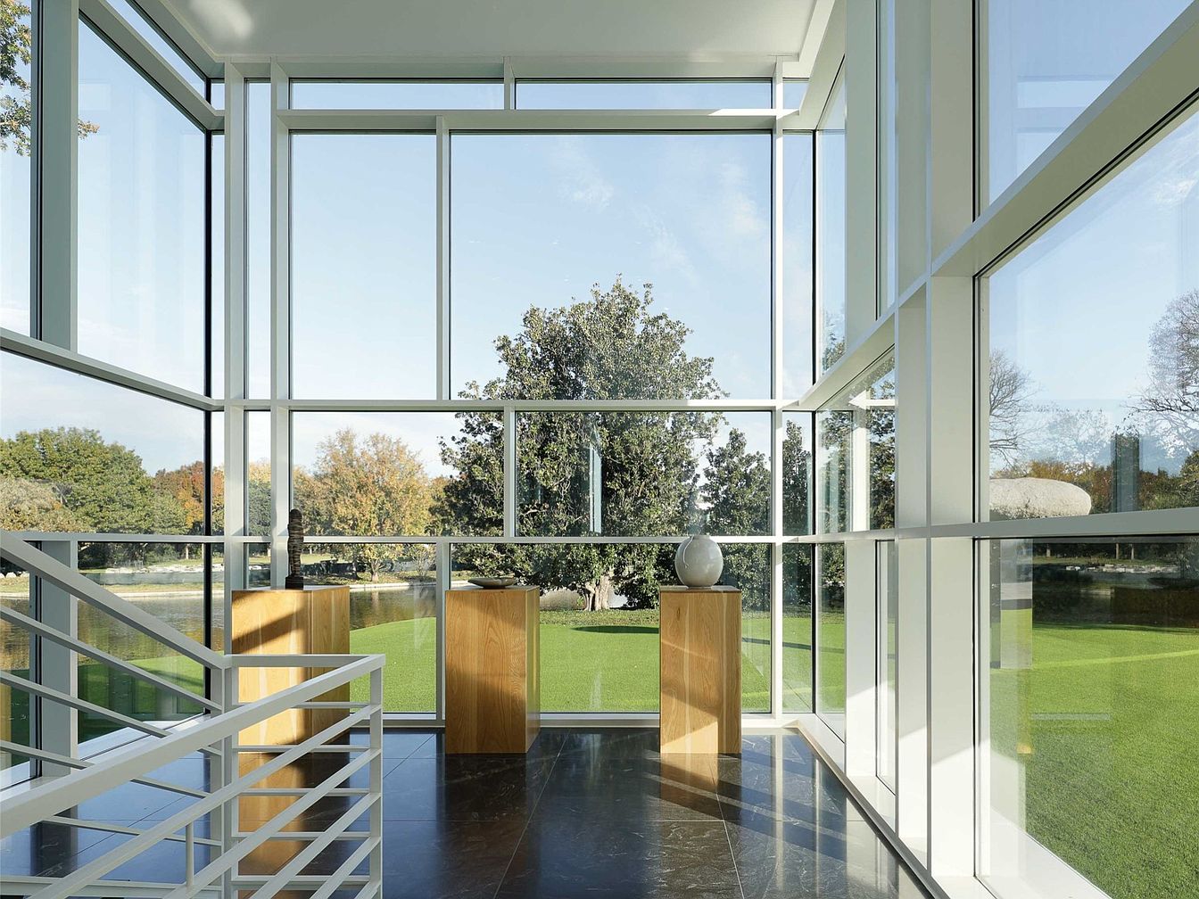 A stunning stairway landing is enveloped by expansive floor-to-ceiling glass walls, flooding the space with natural light and offering panoramic views of the lush green lawn and surrounding landscape. Minimalist white framing creates a crisp, modern architectural detail that harmonizes with the sleek black stone flooring. This area is adorned with simple wooden plinths displaying sculptural pieces, emphasizing sophistication yet leaving ample open space for movement, making it safe and inviting for families with children. The tranquil color palette of natural wood, white, and green promotes a calming atmosphere perfect for admiring the outdoors or pausing between floors.