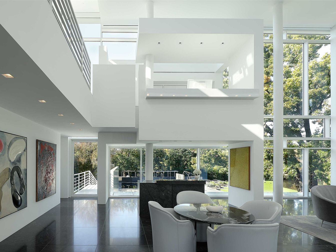 A double-height dining area is filled with natural light through expansive floor-to-ceiling windows, offering serene views of the surrounding landscape. Modern art adorns crisp white walls, and the open floor plan seamlessly connects the dining, kitchen, and living zones. Sleek marble flooring and a round dining table with plush, comfortable chairs invite family gatherings and casual meals. The neutral palette and minimalistic furnishings foster a tranquil, airy feel. Glass doors lead outdoors, providing easy access for children and pets, while open railings and clean lines maintain a sense of spaciousness and family-friendly connectivity throughout the home.