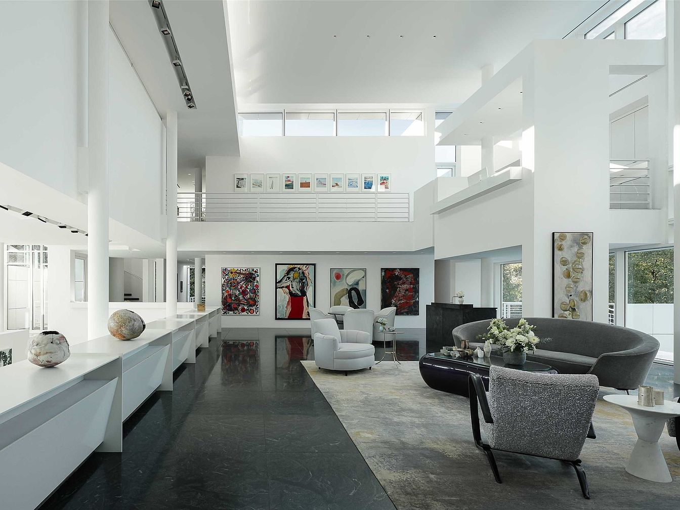 This expansive living room features soaring ceilings, abundant natural light, and an open-concept layout, creating an airy and inviting atmosphere perfect for families. Crisp white walls contrast elegantly with the sleek dark flooring, while modern art pieces and sculptures introduce pops of color and creativity. The furniture arrangement encourages conversation with cozy curved sofas and armchairs set atop a textured area rug. Large windows provide scenic outdoor views and ensure the space is bright throughout the day. Minimalist architectural details, railings, beams, and open walkways, add visual interest while maintaining a sense of spaciousness suitable for gatherings and relaxation.
