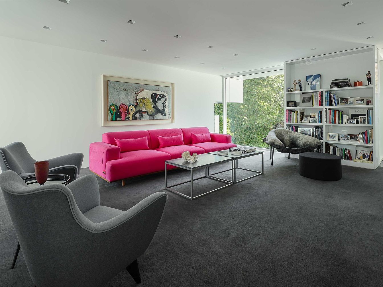 A spacious and inviting living room features a striking hot-pink sectional sofa as the focal point, complemented by two modern gray armchairs for ample seating. Large windows provide abundant natural light, offering picturesque views of lush greenery just outside. The built-in bookshelf is filled with books, family photos, and personal décor, making the space feel welcoming and family-friendly. A modern abstract painting adds artistic interest above the sofa, while a sleek metal and glass coffee table anchors the sitting area. The neutral dark-gray carpeting and white walls create a sophisticated, contemporary backdrop for vibrant and personalized touches.