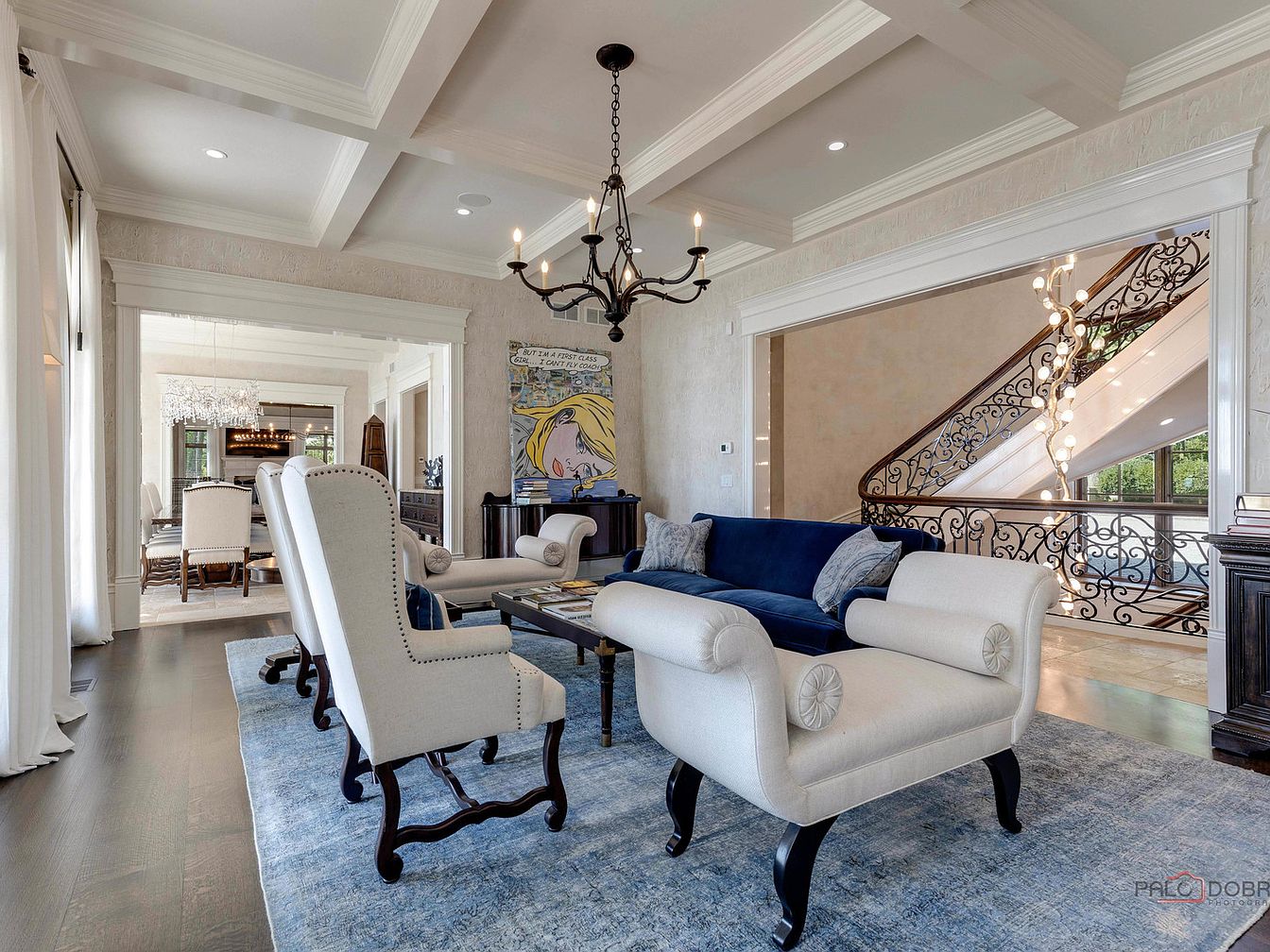 This sophisticated living room features a harmonious blend of classic and contemporary design, showcasing coffered ceilings and rich textures. The soft beige walls complement the plush navy sofa, accented with decorative cushions for added comfort. High-backed armchairs with nailhead detailing provide stylish seating, inviting warmth and conversation. A lavish chandelier hangs gracefully above, casting a welcoming glow. The dark hardwood flooring contrasts beautifully with the light color palette, while an ornate area rug defines the seating area. Open to the dining space, this layout fosters family gatherings and an airy flow throughout the home, enriched by natural light.