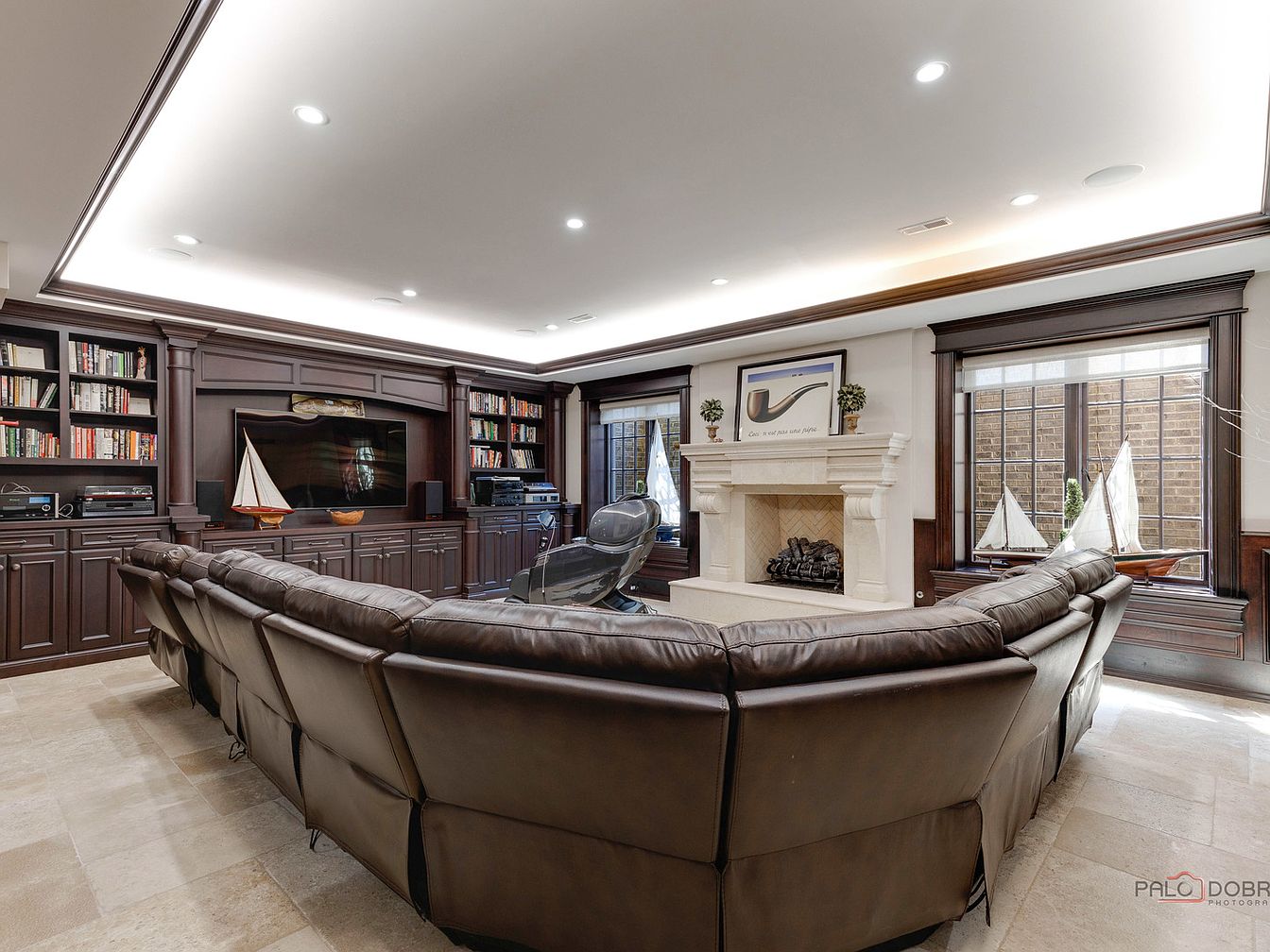 This inviting family room features a spacious layout, perfect for gatherings and relaxation. Rich, dark wood cabinetry lines the walls, housing a collection of books and entertainment equipment, creating a warm, library-like atmosphere. Plush, brown leather seating forms a generous semi-circle around a modern media center, ensuring everyone enjoys a great view. A stunning stone fireplace adds a focal point, flanked by elegant windows that invite natural light, enhancing family-friendly vibes. The neutral color palette, complemented by soft beige stone flooring, strikes a balance between elegance and comfort, making this space a delightful retreat for all ages.