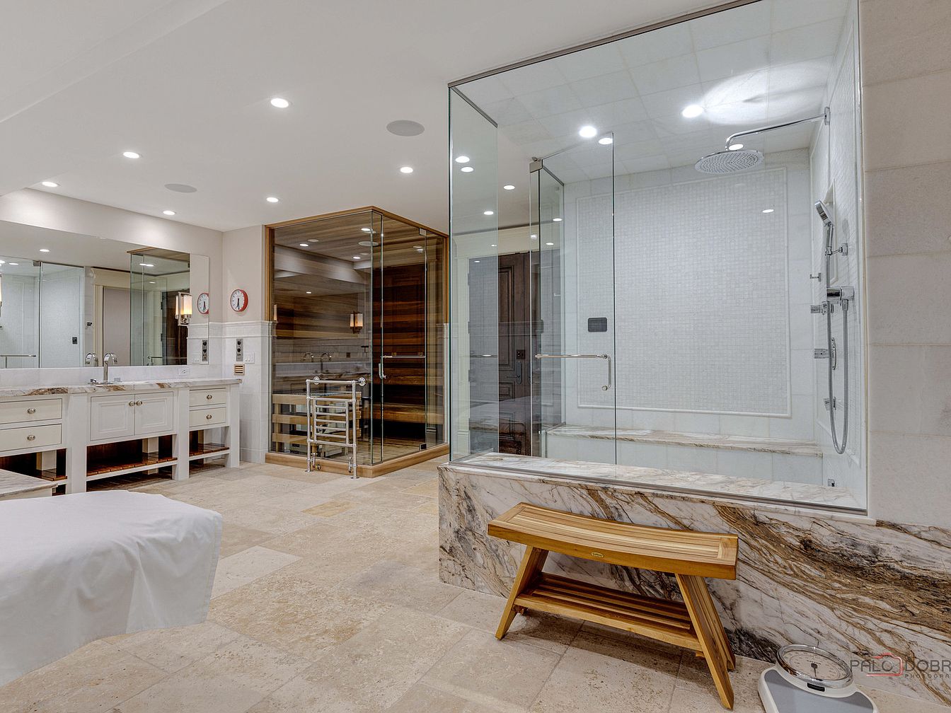 This luxurious bathroom blends modern elegance with comfort. A spacious double vanity features polished white cabinetry and exquisite marble countertops, offering ample storage and a sophisticated look. The seamless glass shower provides a spa-like experience, complemented by high-end fixtures and pebble-stone accents. A sauna area adds an exclusive touch, promoting relaxation after a long day. The warm beige tile flooring creates a harmonious flow throughout the space, while recessed lighting casts a soft glow, enhancing the inviting atmosphere. Carefully chosen accessories, like sleek mirrors and decorative clocks, elevate the design, making this bathroom a perfect family-friendly retreat.