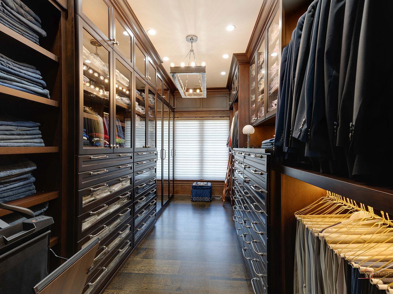 A luxurious walk-in closet showcases premium wood cabinetry with a rich, dark finish, enhancing the space’s elegance. Custom shelving displays neatly folded denim and stacked shirts, while tailored suits hang in perfect alignment, exemplifying organization. Sleek handles and modern lighting fixtures add contemporary sophistication. The layout provides ample storage with deep drawers underneath, and a dedicated shoe display highlights footwear. Natural light filters through elegant blinds, creating a warm and inviting atmosphere. Thoughtfully designed for family convenience, this closet combines functionality and style, making it a perfect retreat for wardrobe selection.