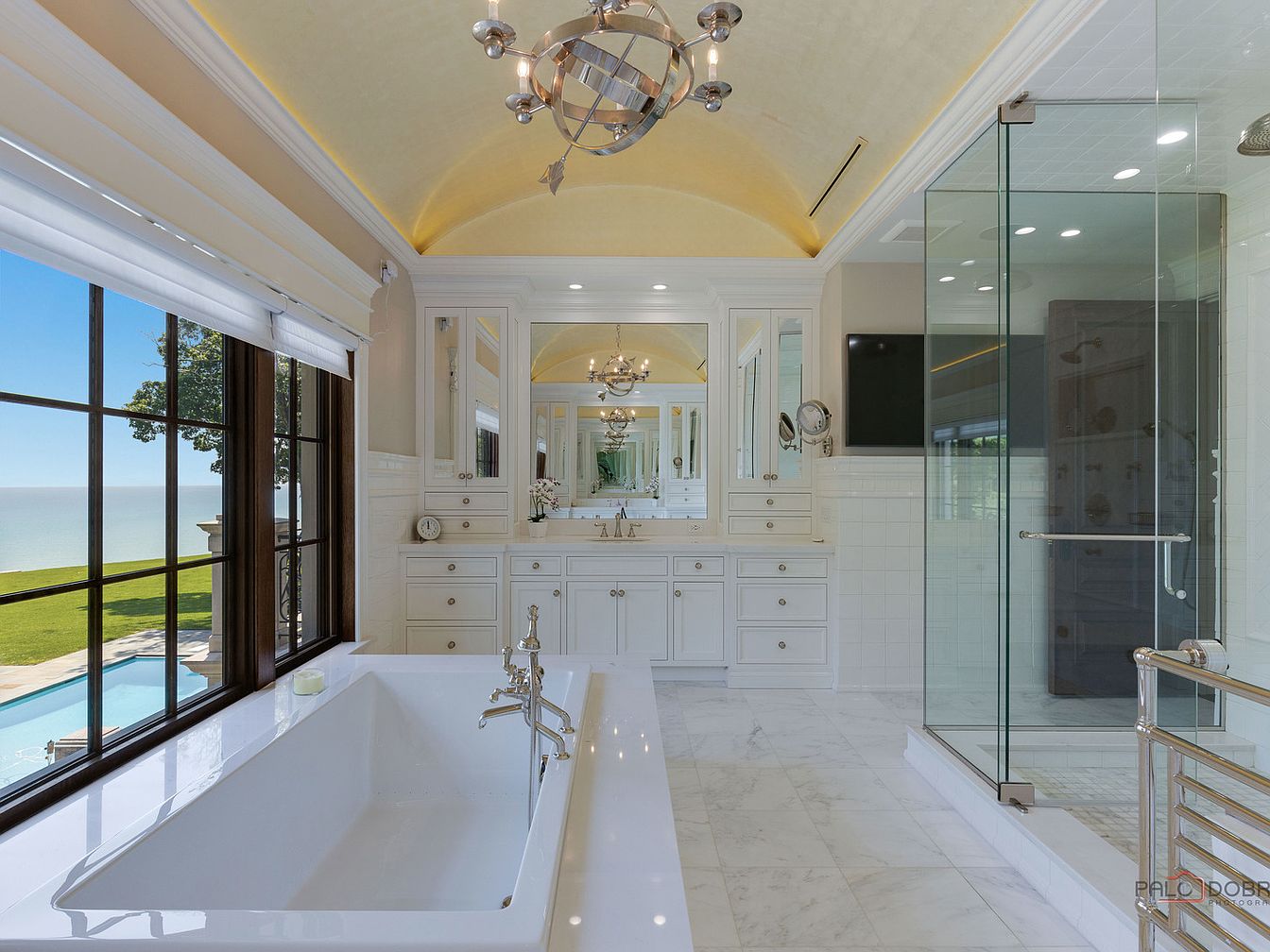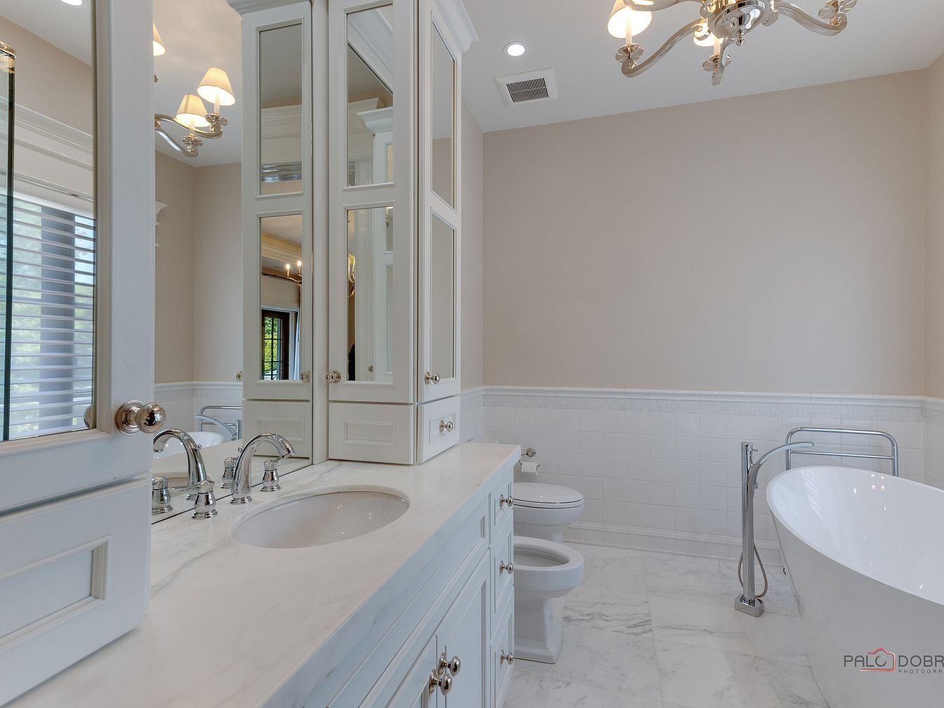 This master bathroom showcases a stunning blend of functionality and luxury. The spacious layout features a marble countertop paired with polished chrome fixtures that add a touch of sophistication. A freestanding soaking tub invites relaxation, positioned next to large, elegantly designed windows that flood the space with natural light. The cabinetry, painted in a soft blue hue, harmonizes beautifully with the cream-colored walls and white ceramic tile, creating a tranquil atmosphere. Thoughtfully integrated storage solutions ensure a clutter-free environment, making it a family-friendly retreat. The ceiling-mounted chandelier adds a glamorous finish, enhancing the overall aesthetic.