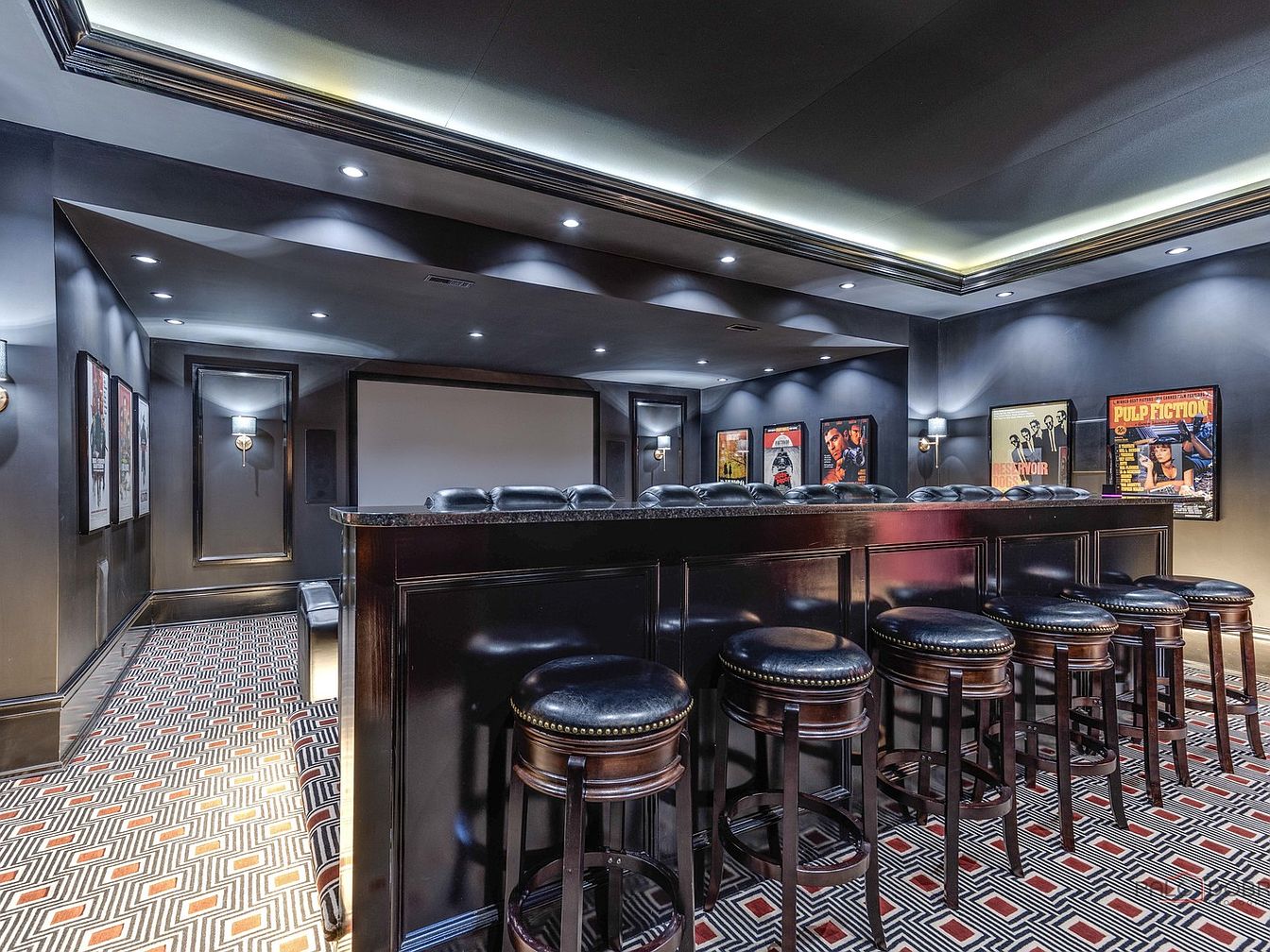 This stylish home theater bar showcases a sophisticated blend of comfort and entertainment. The layout features a sleek, dark cabinetry with a polished granite countertop, providing an inviting space for family gatherings. Black leather bar stools encircle the counter, perfect for enjoying drinks during movie nights. The walls are adorned with classic film posters, enhancing the cinematic ambiance, while adjustable recessed lighting casts a warm glow. The patterned area rug adds a touch of visual interest, contrasting beautifully with the dark walls. Overall, this space exudes a cozy yet upscale vibe, ideal for memorable family experiences.