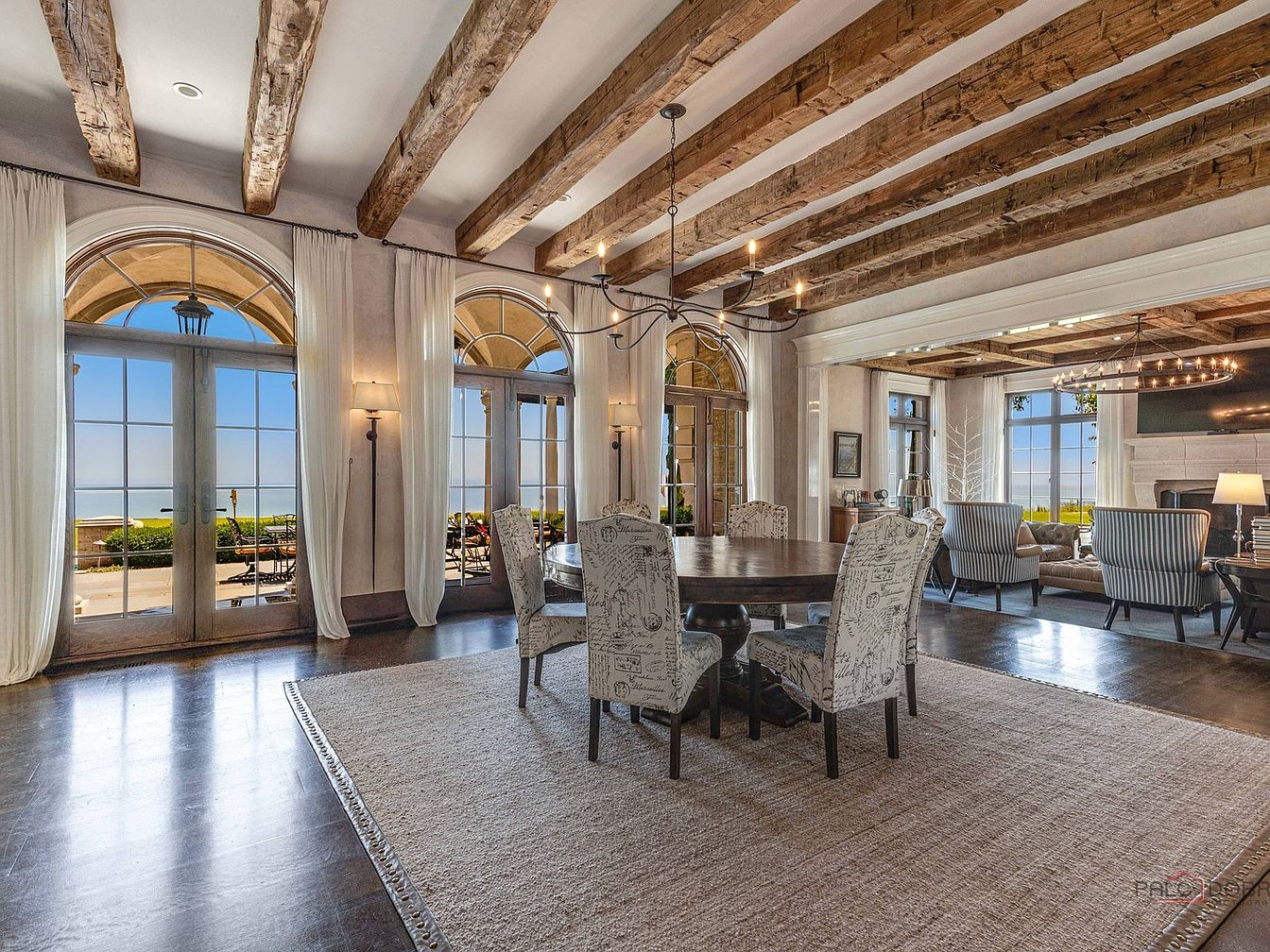 This elegant dining room features a large, round table surrounded by upholstered chairs with intricate patterns, perfect for family gatherings. Natural light floods through expansive arched windows, showcasing stunning views of the outdoors. Exposed wooden beams add rustic charm to the high ceiling, while soft drapery enhances the warmth. The rich, dark hardwood floors contrast beautifully with the light tones of the walls and furniture. Family-friendly elements include ample seating and an inviting layout that encourages conversation. A stylish chandelier hangs over the table, adding a touch of sophistication while maintaining a cozy ambiance, making it ideal for entertaining.