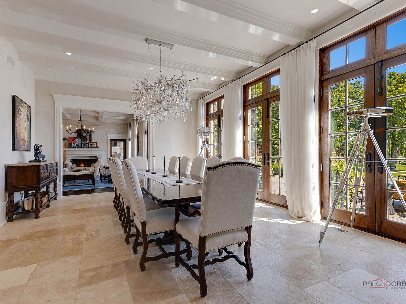 The dining room exudes modern elegance, featuring a long, stylish table surrounded by high-backed upholstered chairs that invite comfort and conversation. A stunning chandelier with intricate detailing hangs from the coffered ceiling, casting a warm glow over the space. The walls are painted in soft hues, enhancing the airy atmosphere, while large windows framed by sheer curtains offer abundant natural light and views of the lush outdoors. Rich wooden accents in the furniture add warmth, complemented by exquisite marble flooring. This inviting room is perfect for family gatherings or entertaining guests, blending sophistication with a family-friendly ambiance.