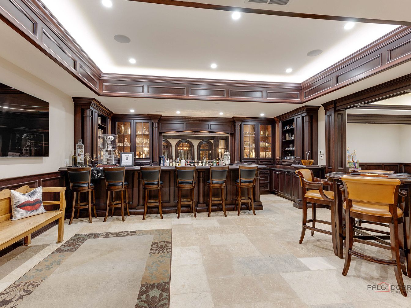 This elegant home bar area features rich wooden cabinetry that showcases various beverages and glassware, providing a sophisticated ambiance for entertaining. The layout includes a long, inviting bar with high-backed stools, perfect for gathering with friends and family. Soft recessed lighting washes over the space, enhancing the warm tones of the wood and the neutral tile flooring. A plush area rug adds comfort, while the bench with a playful pillow invites relaxation. Decorative details like the framed mirrors and stylish bar accessories reflect both luxury and functionality, creating a welcoming environment for memorable social moments.