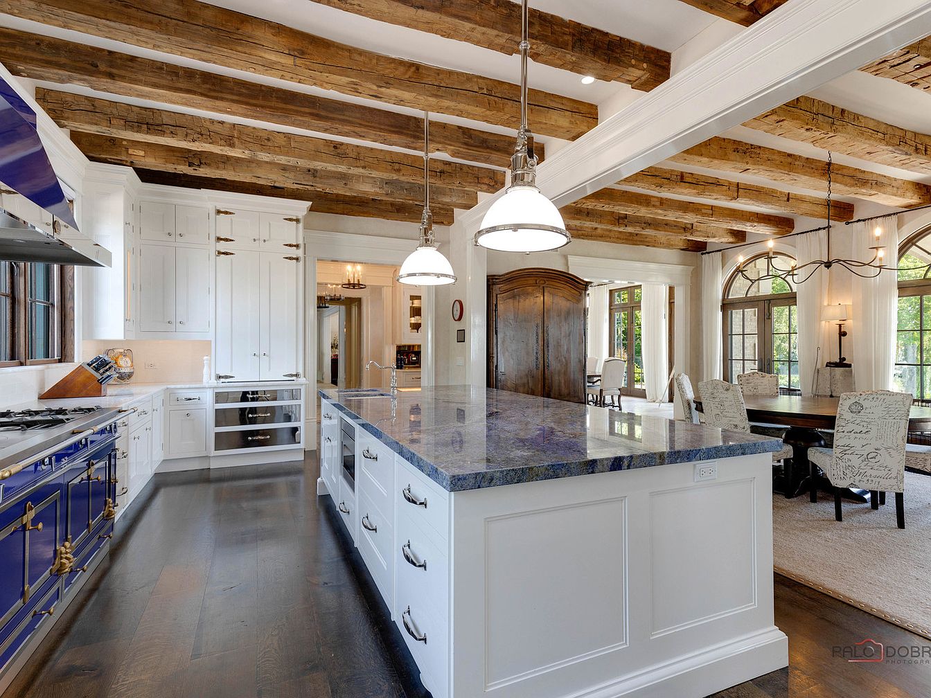 This kitchen blends functionality with rustic charm, featuring a spacious layout centered around a striking island topped with rich blue granite. Elegant white cabinetry complements the bold, vintage-style gas range, seamlessly merging modern appliances with traditional aesthetics. Exposed wooden beams add warmth to the high ceiling, creating an inviting atmosphere. Ample natural light floods the area through large windows, highlighting the dark hardwood flooring and stylish pendant lighting. Family-friendly design elements include an open-concept dining area nearby, promoting togetherness while cooking. Thoughtful details, like the glass-fronted cabinetry, enhance the charm and provide easy access to essentials.