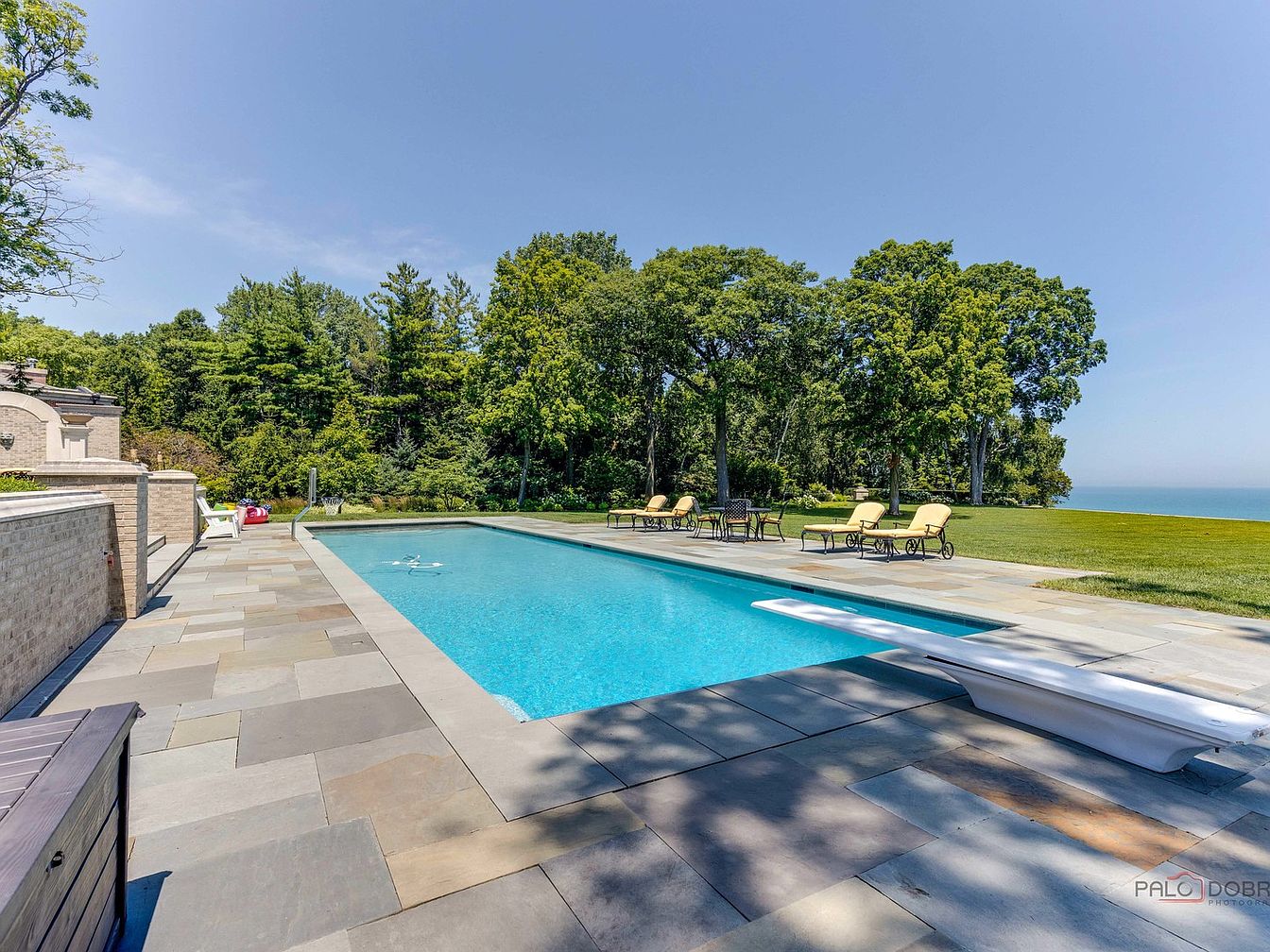 This stunning backyard features a beautifully designed swimming pool, surrounded by a spacious patio made of elegant stone tiles. The pool area is complemented by comfortable lounge chairs in a soft yellow hue, inviting relaxation under the warm sun. Lush greenery encircles the space, providing a tranquil and private atmosphere. The open layout encourages family activities, while the diving board adds a playful touch for children and adults alike. The seamless integration of nature and luxurious design elements makes this outdoor retreat perfect for gatherings and leisure, setting a serene tone for summertime enjoyment.