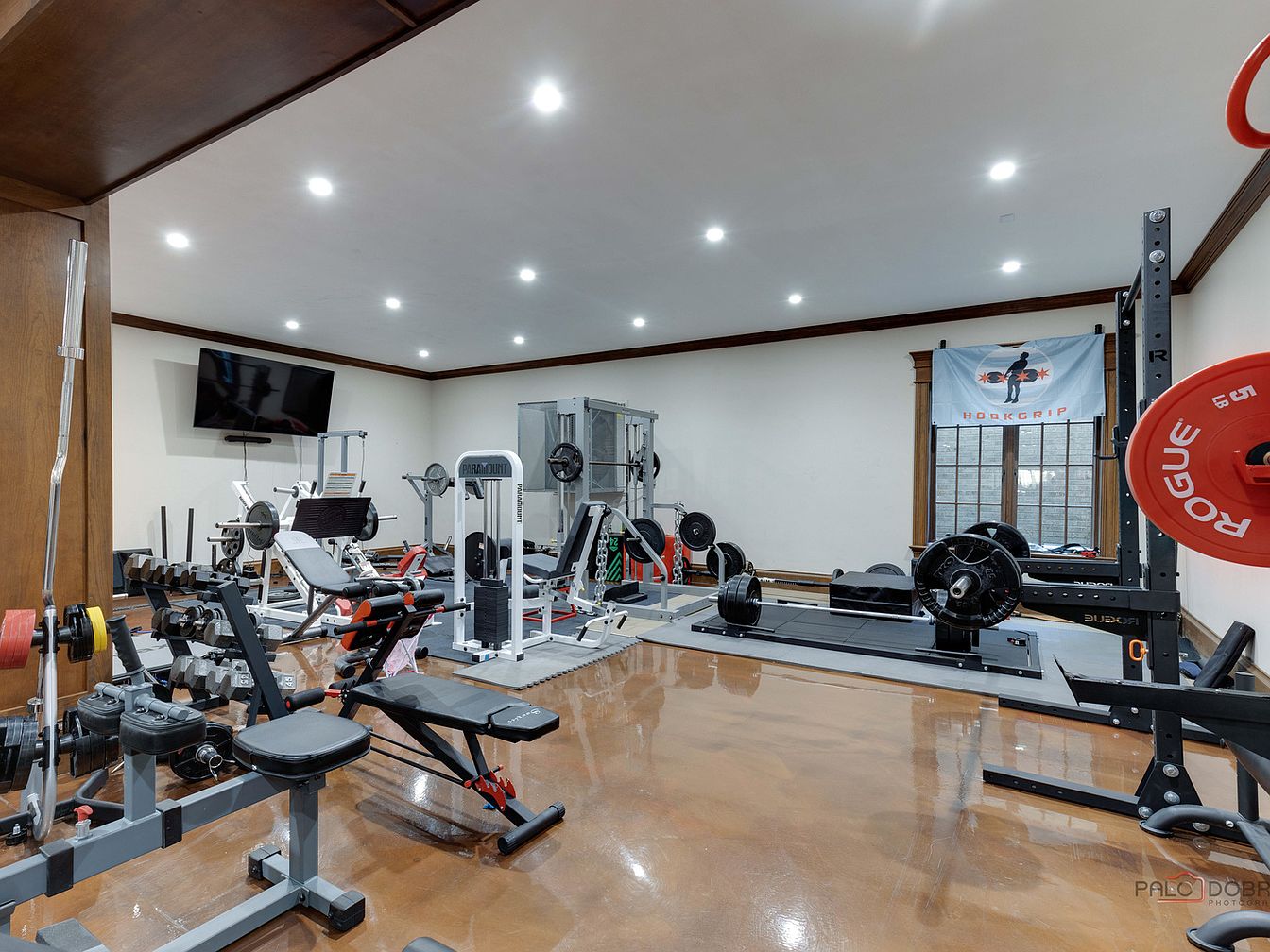 This spacious home gym boasts an open layout with a polished concrete floor that reflects the ambient lighting, creating an inviting atmosphere for fitness enthusiasts. Equipped with a variety of high-quality workout machines and free weights, the room caters to all fitness levels. The walls are painted in a neutral tone, while the dark wood trims add warmth and sophistication. A mounted television allows for entertainment during workouts, enhancing motivation. Large windows provide natural light, ensuring a bright and energizing space. This family-friendly gym encourages healthy habits while incorporating style into everyday fitness routines.