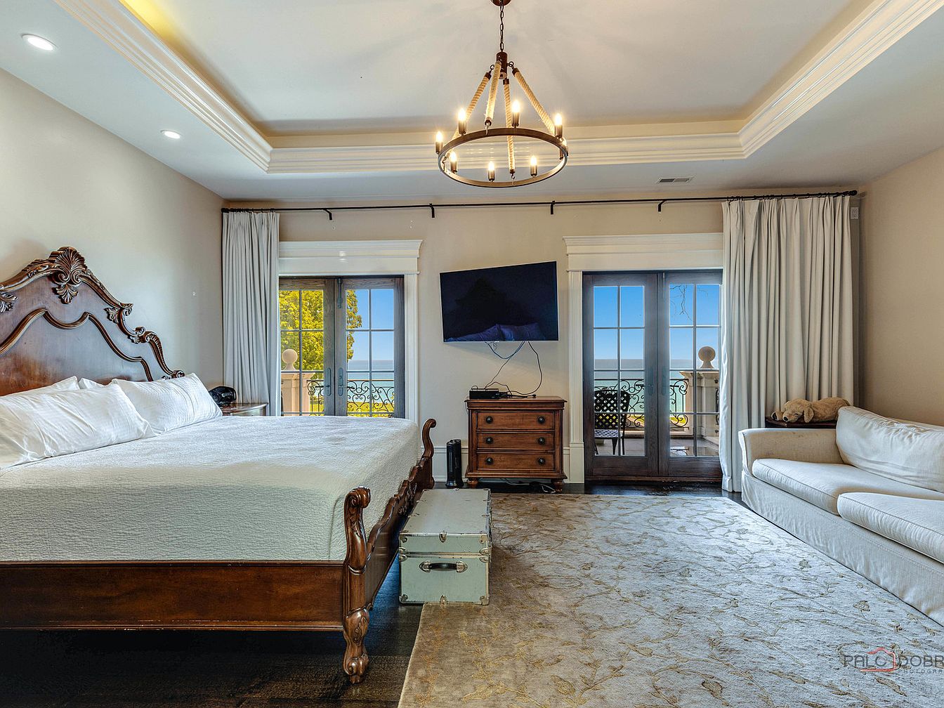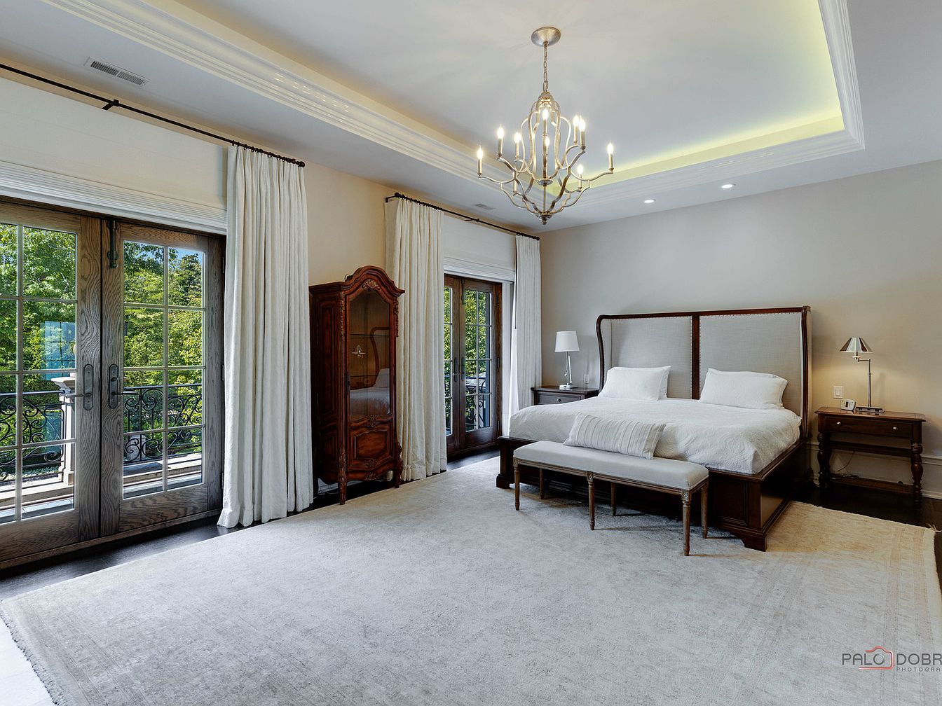 This elegant master bedroom showcases a harmonious blend of classic and modern aesthetics. A grand wooden bed with intricately carved details serves as the focal point, complemented by a plush white comforter for a cozy touch. Natural light floods the space through expansive double doors that lead to a private balcony, enhancing the room’s airy feel. Soft beige walls and tasteful drapery create a warm ambiance, while the patterned area rug adds subtle texture. A stylish chandelier overhead provides both illumination and sophistication, ensuring this space is both tranquil and inviting, perfect for relaxation.