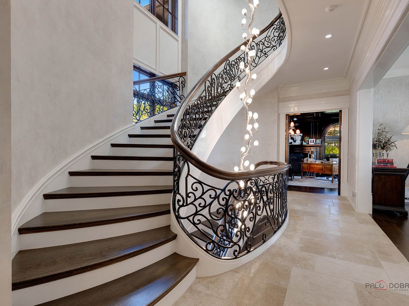 This grand foyer features a stunning curved staircase with rich dark wood treads that contrast beautifully against the light marble floor. Ornate wrought-iron railing adds a classic touch, while a cascading chandelier of soft-lit fixtures illuminates the space, creating a warm ambiance. The high ceilings and ample natural light stream through large windows, enhancing the openness of the layout. Neutral walls adorned with subtle textures provide a serene backdrop, perfect for family gatherings. The adjoining rooms, visible through the doorway, hint at a well-coordinated aesthetic that seamlessly blends elegance and comfort, making it inviting for guests.