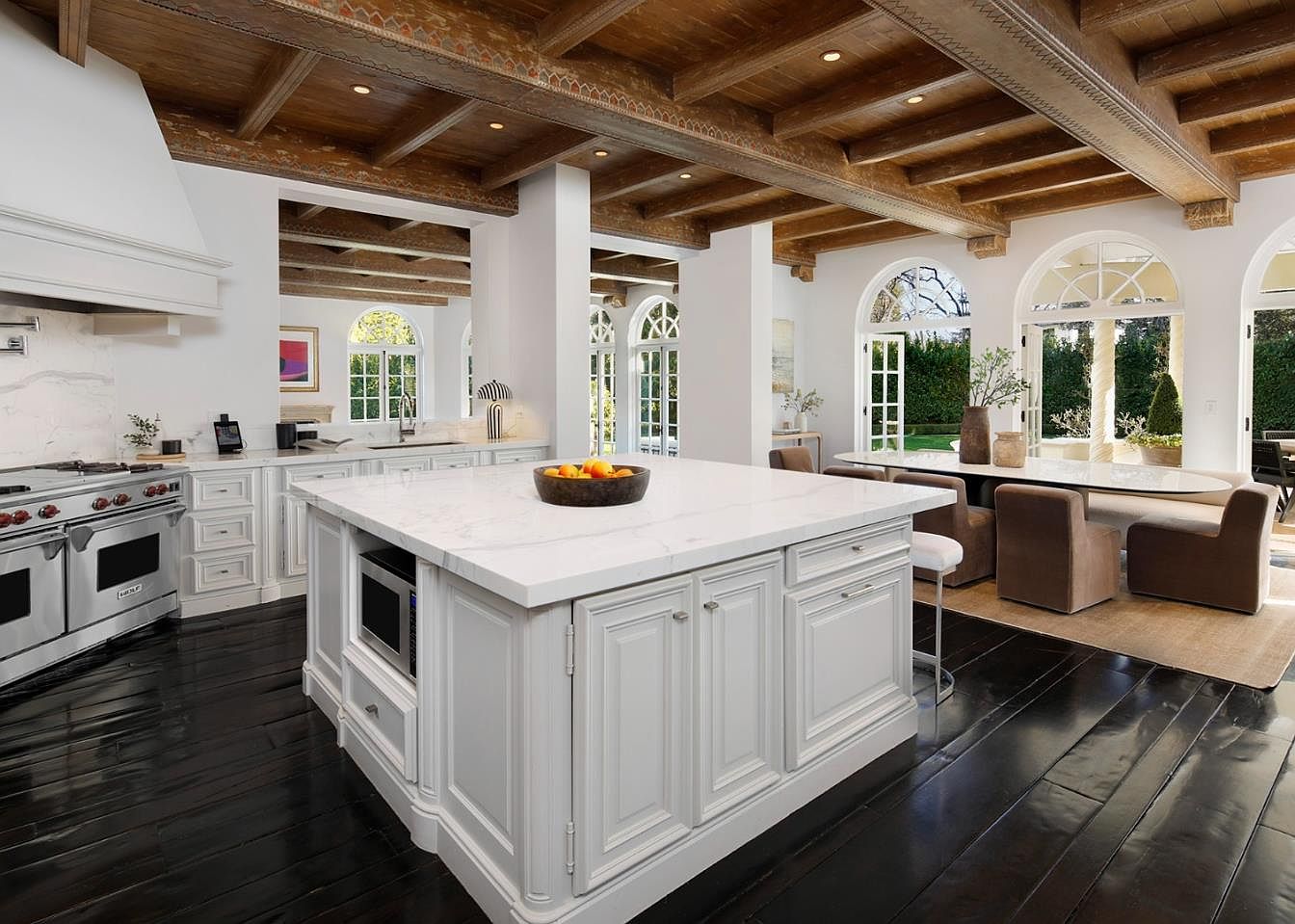 This open-concept kitchen and dining space blends rustic charm with modern elegance, featuring a large marble island perfect for family gatherings or meal prep. The coffered wood ceiling with decorative molding adds warmth and texture, while crisp white cabinetry and stainless steel appliances create a bright, welcoming atmosphere. Oversized windows and arched French doors flood the area with natural light, seamlessly connecting the interior to the outdoor patio. Ample seating around the dining table and a cozy breakfast nook make this space ideal for entertaining or casual family meals. Soft neutral tones and dark polished floors provide a timeless, sophisticated backdrop.