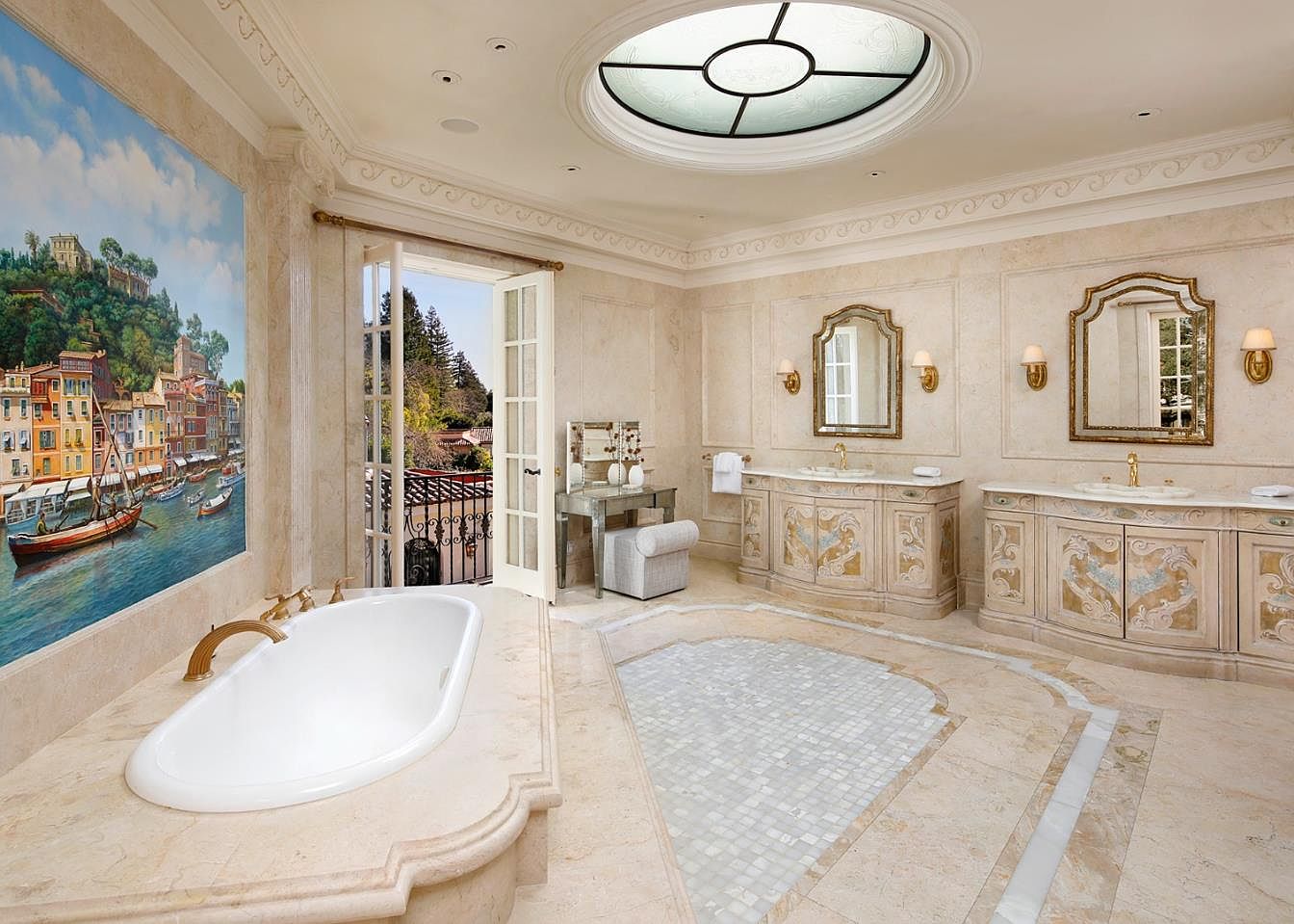 An expansive master bathroom featuring elegant cream-toned marble floors and ornate detailing throughout. The centerpiece is a sunken soaking tub with gold fixtures, perfectly positioned beneath a vibrant mural reminiscent of a Mediterranean harbor. Twin vanities with gold-trimmed mirrors and intricate cabinetry provide generous counter space, ideal for family use. Natural light pours in through French doors that open to a private balcony. The space is illuminated by a large circular skylight, highlighting the sophisticated wall sconces and crown moldings. A cozy vanity area with a plush stool offers a functional touch, blending comfort and refined elegance into this family-friendly retreat.