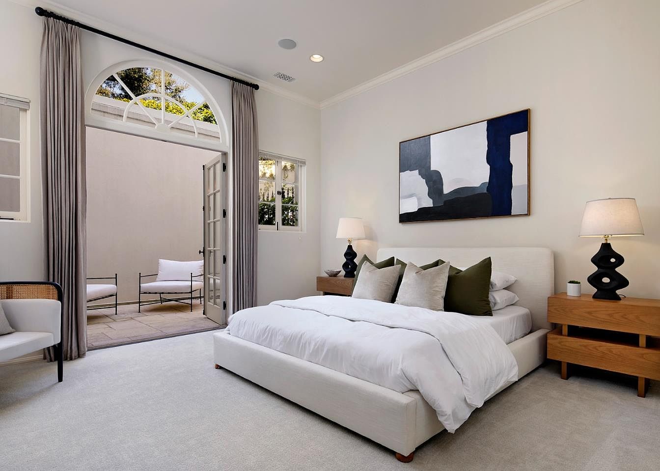 This serene bedroom features a soft neutral palette with light gray walls and plush carpeting, creating a calm and inviting atmosphere perfect for restful nights. Large French doors with arched windows open directly to a private patio, seamlessly blending indoor and outdoor living and providing ample natural light. The room is furnished with a low-profile upholstered bed, generous throw pillows in olive and beige tones, and matching wooden nightstands topped by modern black lamps. Minimalist abstract art adds visual interest, while comfortable seating and layered textures ensure a cozy, family friendly space suitable for relaxation and bonding.