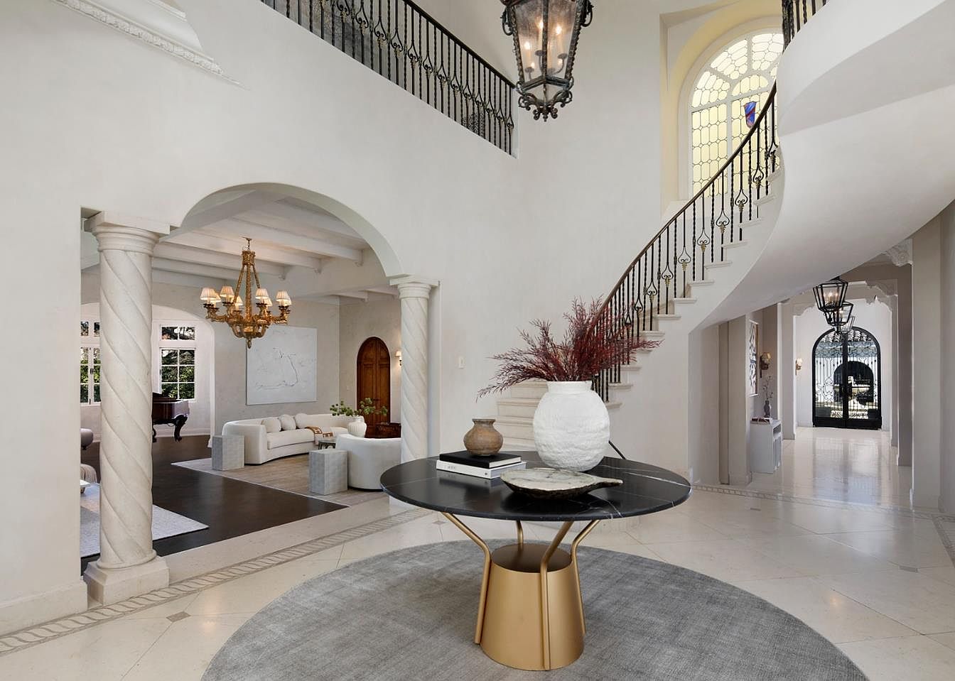 An airy, light-filled grand foyer showcases elegant architectural details with sweeping curves of a staircase and intricate wrought-iron railings. Soaring ceilings and arched doorways, flanked by twisted columns, open into a spacious living room arranged for gatherings and family relaxation. Soft neutral walls and floors create a serene ambiance, complemented by warm gold and bronze fixtures, such as a large chandelier and modern lanterns. A round black and gold entry table with a bold vase centerpiece anchors the space, inviting guests to feel at home. Large windows and thoughtful furnishings highlight both sophistication and family comfort.