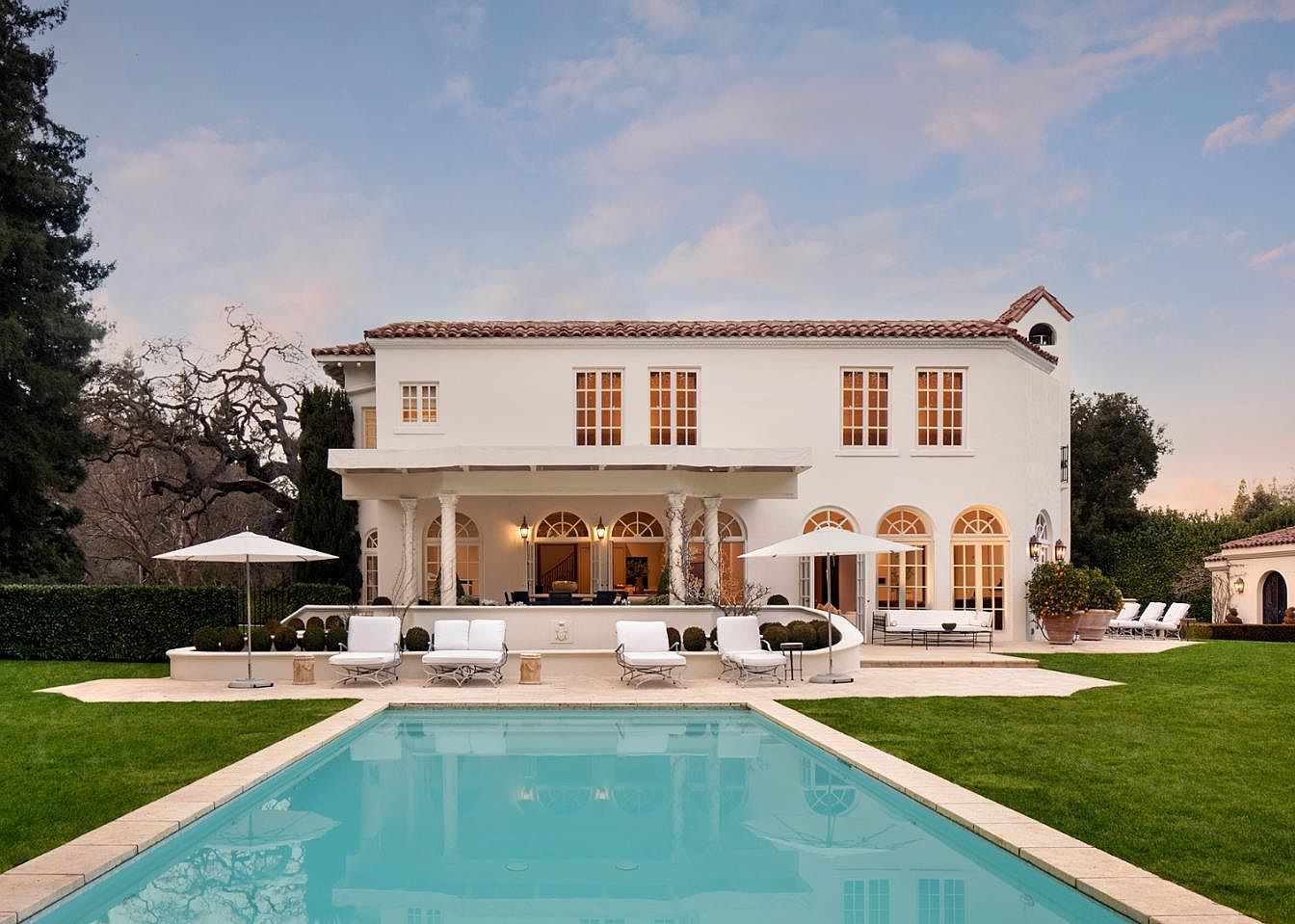 A spacious backyard features a crystal-clear rectangular pool surrounded by meticulously manicured green lawns and paved walkways. The white stucco exterior and terracotta tile roof evoke classic Mediterranean style, complemented by arched windows and columns that create a timeless elegance. Comfortable white loungers and umbrellas invite family and guests to relax by the water, making this outdoor space ideal for gatherings and play. The covered patio provides shade and a seamless transition between indoor and outdoor living. This area is perfect for children to play and adults to entertain, all in a serene and welcoming atmosphere.