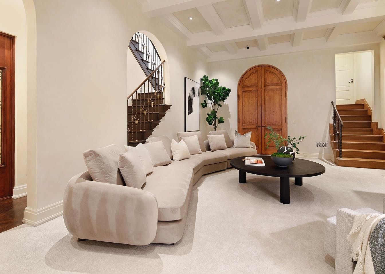 A spacious, light-filled living room features a large, plush sectional sofa in a soft beige tone, providing ample seating for family gatherings or entertaining guests. The neutral color palette is complemented by creamy walls and a cozy light carpet, creating a warm, inviting ambiance. Natural wood elements are highlighted in the arched double doors and staircase, lending a classic yet modern touch. A round, dark coffee table anchors the room, adorned with simple greenery and books for a lived-in feel. Stylish architectural touches, such as arched openings, coffered ceiling, and iron stair railings, complete the sophisticated, family-friendly design.